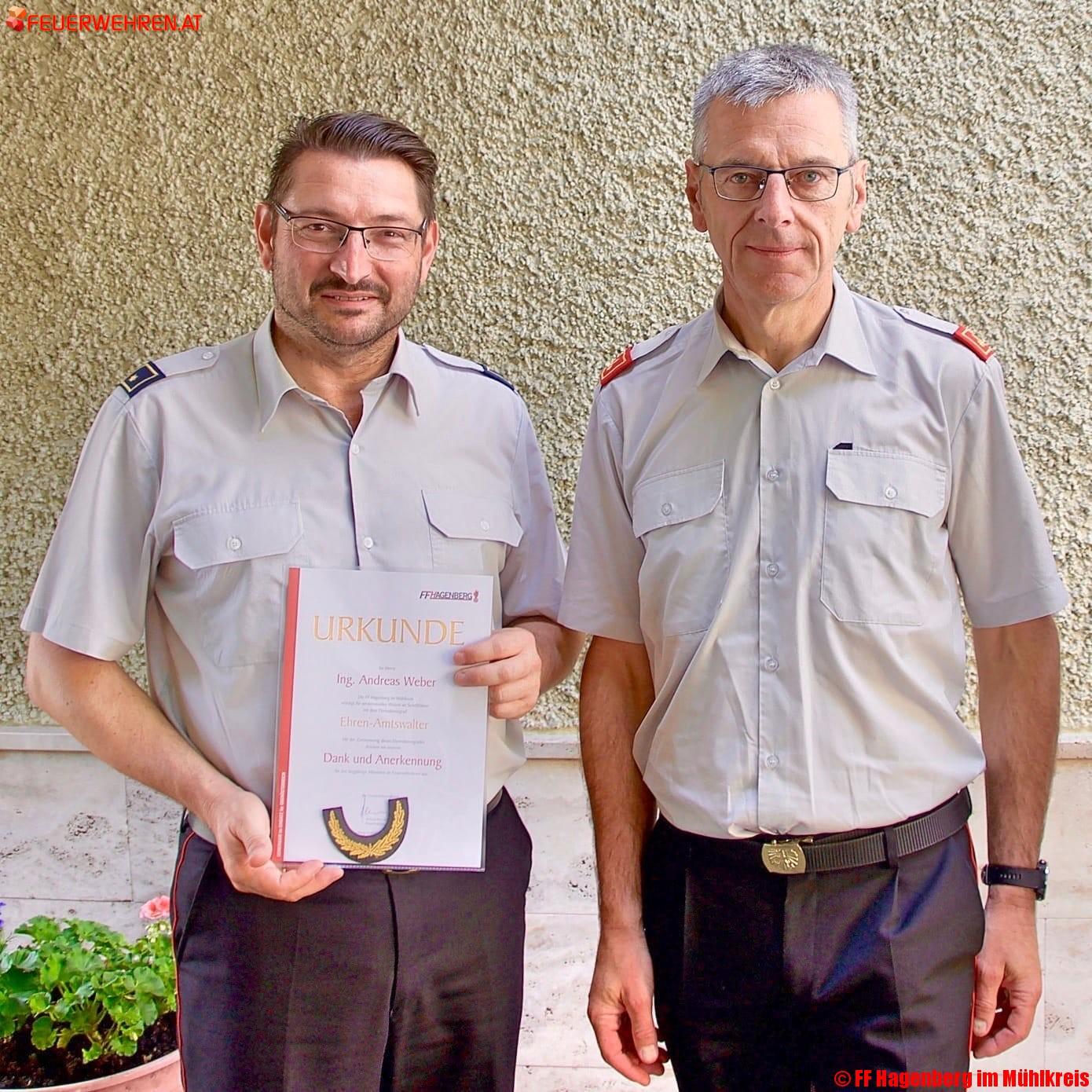Ein Vierteljahrhundert – diese Zeitspanne lang führte Andreas Weber sein Amt als Schriftführer vorbildlich und gewissenhaft aus. In Anerkennung seiner Leistungen wurde ihm am 31. Mai durch Kommandant Konrad Remplbauer der Dienstgrad „Ehren-Amtswalter“ verliehen.