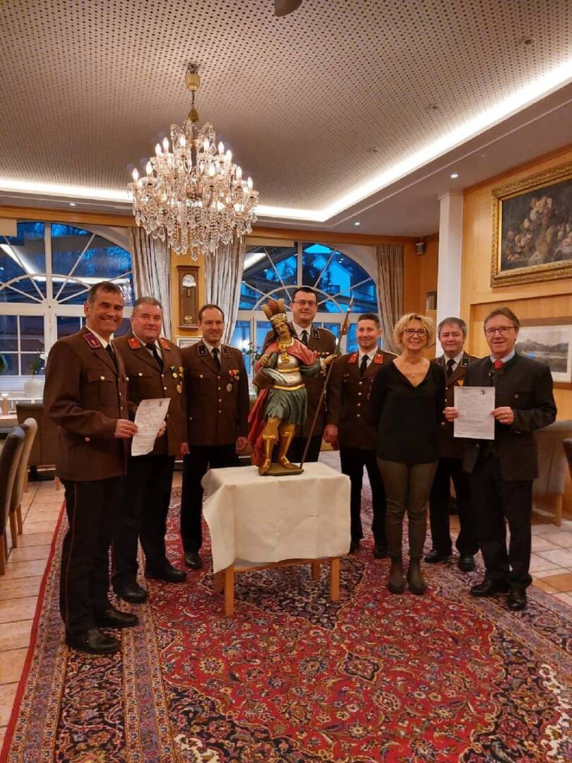 Die Aufnahmezeremonie fand nicht zufällig im Hotel Gasthof Krone statt. Nach dem Ableben von Fahnenmutter Elisabeth Marschallinger hatte sich Waltraud Hütter, die Chefin „der Krone“ spontan bereit erklärt, diese ehrenvolle und ehrenamtliche Aufgabe zu übernehmen. Das Foto mit den neugewonnenen Mitgliedern der Freiwilligen Feuerwehr Mondsee wurde mit der neuen Fahnenmutter Waltraud Hütter und dem Heiligen Florian gemacht.