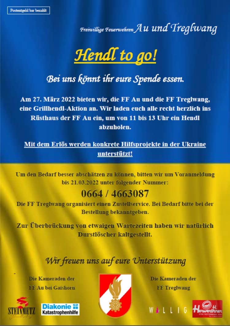 Am 27. März 2022 bieten die Feuerwehren Au bei Gaishorn und Treglwang eine Grillhendl-Aktion an. Wie laden euch alle recht herzlich ins Rüsthaus der FF Au ein, um vom 11 – 13 Uhr ein Hendl abzuholen.