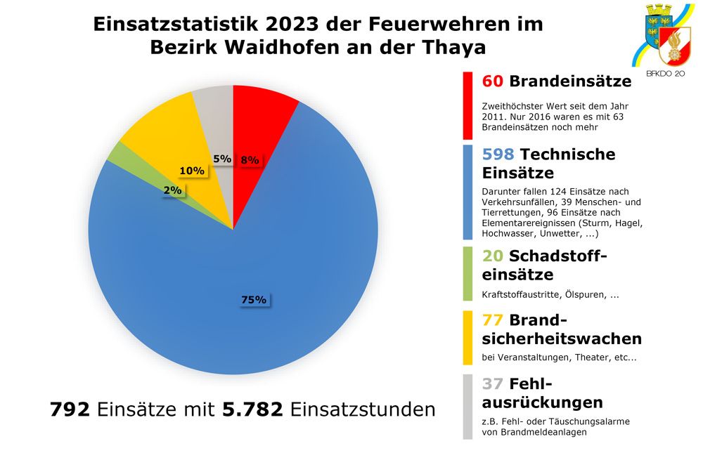 Zu 792 Einsätzen mussten die Freiwilligen Feuerwehren im Bezirk Waidhofen an der Thaya im Jahr 2023 ausrücken. Einen deutlichen Anstieg von 30% gab es bei den Brandeinsätzen, aber auch die Einsätze nach Verkehrsunfällen stiegen um rund ein Viertel an. Das Leistungsvolumen aller freiwillig geleisteten Stunden bei den Feuerwehren im Bezirk betrug im Jahr 2023 4,8 Millionen Euro.