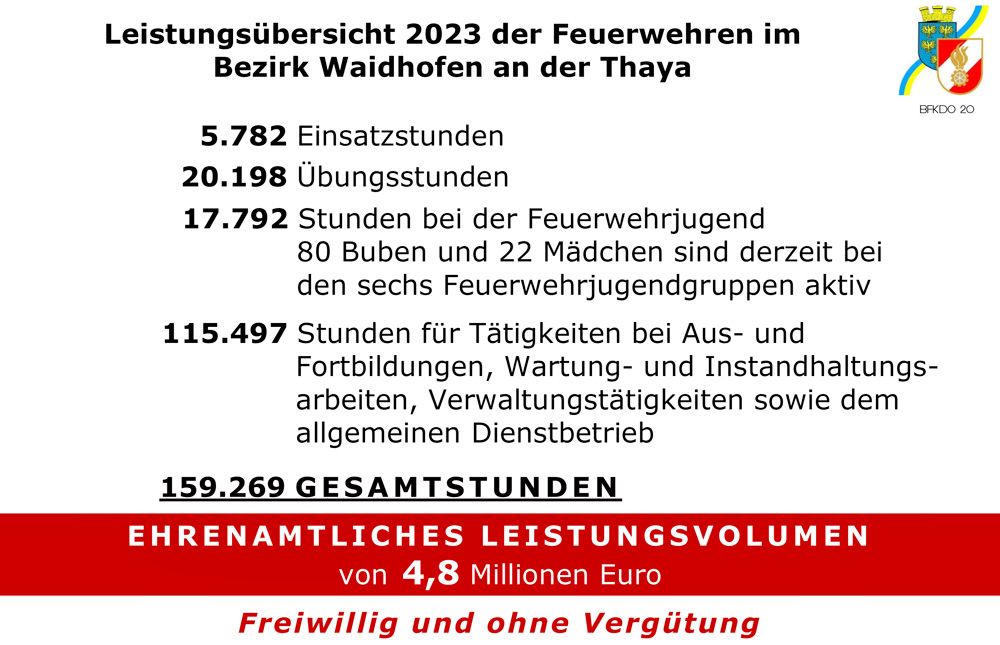 Bei den 112 Freiwilligen Feuerwehren im Bezirk Waidhofen an der Thaya wurden 159.269 Gesamtstunden geleistet. Dies entspricht – bei einem Stundensatz von 30 Euro – einem Leistungsvolumen von 4,8 Millionen Euro. Diese Leistung wird von den Feuerwehrleuten ehrenamtlich erbracht.