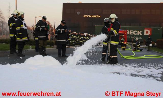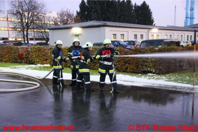 Die Betriebsfeuerwehr Magna Steyr Fahrzeugtechnik setzt stark auf die Ausbildung der Feuerwehrmitglieder! Mit der am Donnerstag, dem 29.11.2011 durchgeführten Branddienstleistungsprüfung erlangten nun 85% aller Mitglieder der Betriebsfeuerwehr, das Branddienstleistungsabzeichen in Bronze, Silber oder Gold. Ingesamt 8 Gruppen (2 Gold-, 4 Silber-, 2 Bronzegruppen) traten zu dieser Leistungsprüfung in der Mannschaftstärke von 48 Teilnehmern an. Bei dieser Branddienstleistungsprüfung müssen die Teilnehmer einen Löschangriff in Form eines Scheunenbrandes (gleichzusetzen mit einem Hallenbrand), einen Flüssigkeitsbrand bzw. einen Holzstapelbrand innerhalb eines vorgegebenen Zeitfensters absolvieren.