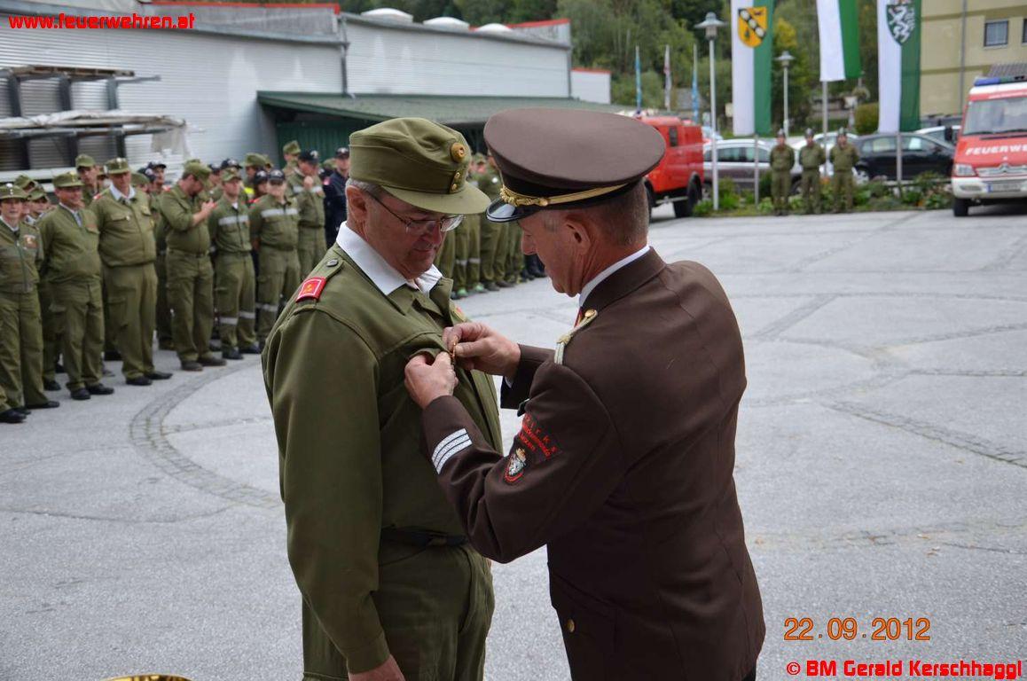 Bevor jedoch die eigentliche Siegerehrung begann, stand noch eine Ehrung eines verdienten Feuerwehrkameraden auf der Tagesordnung. HBI a.D. Dipl.Ing. Werner Präsoll erhielt die Bewerterspange in Bronze für mehr als 5-malige Tätigkeit als Bewerter.