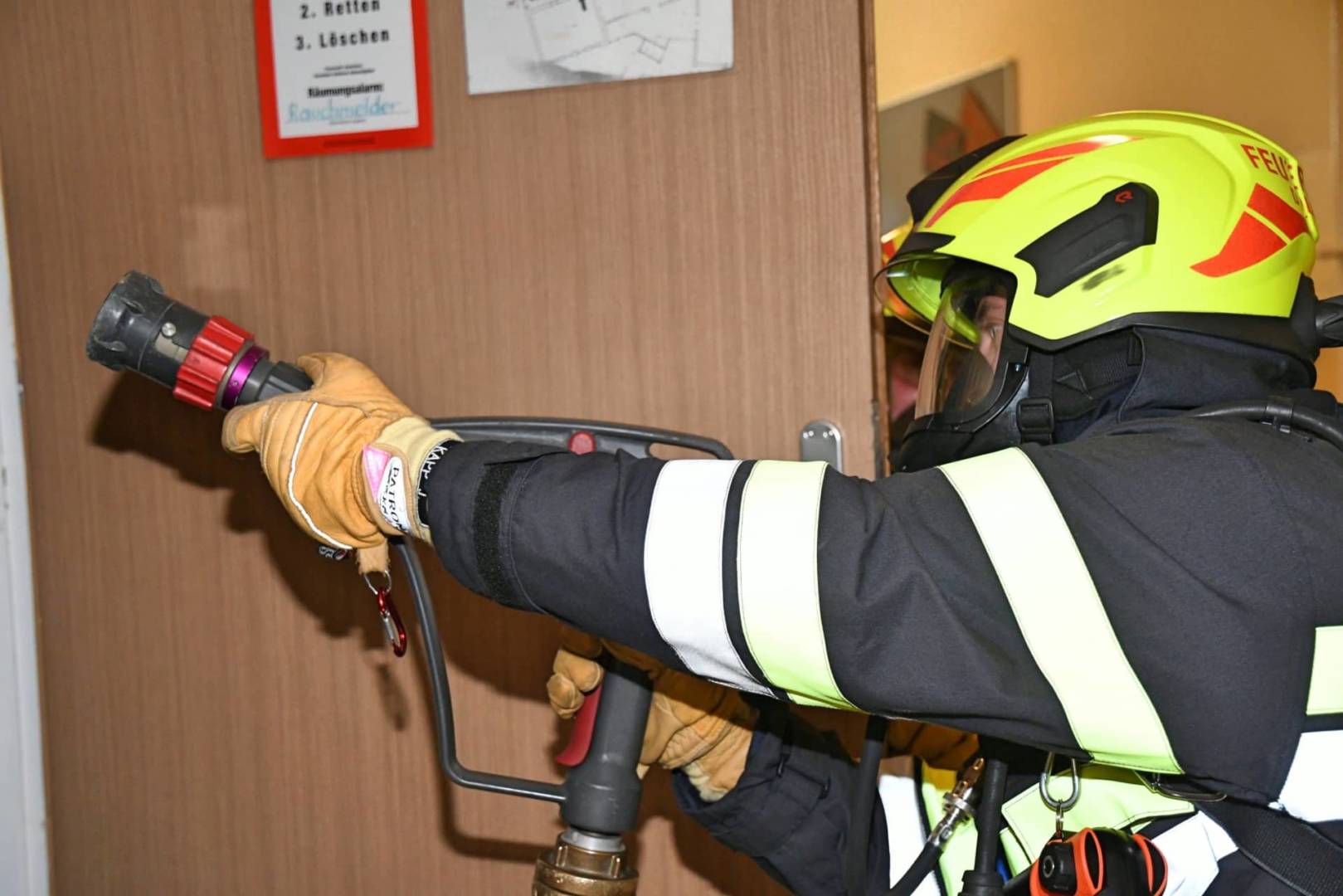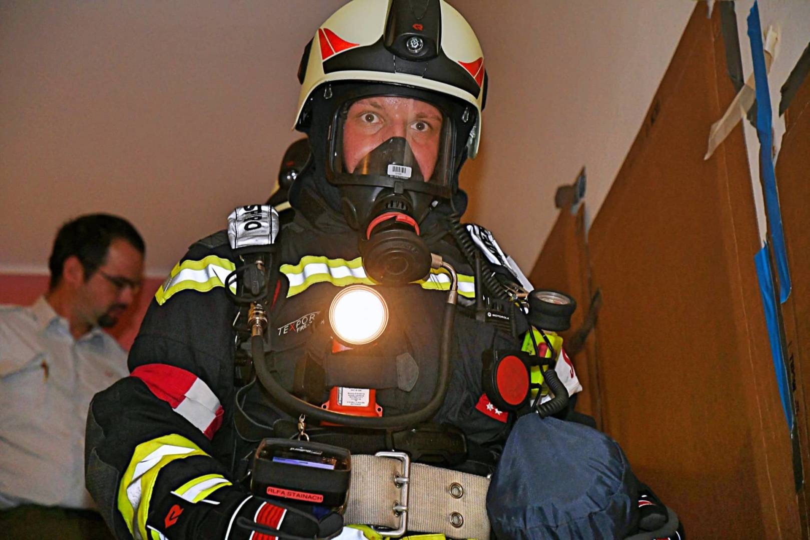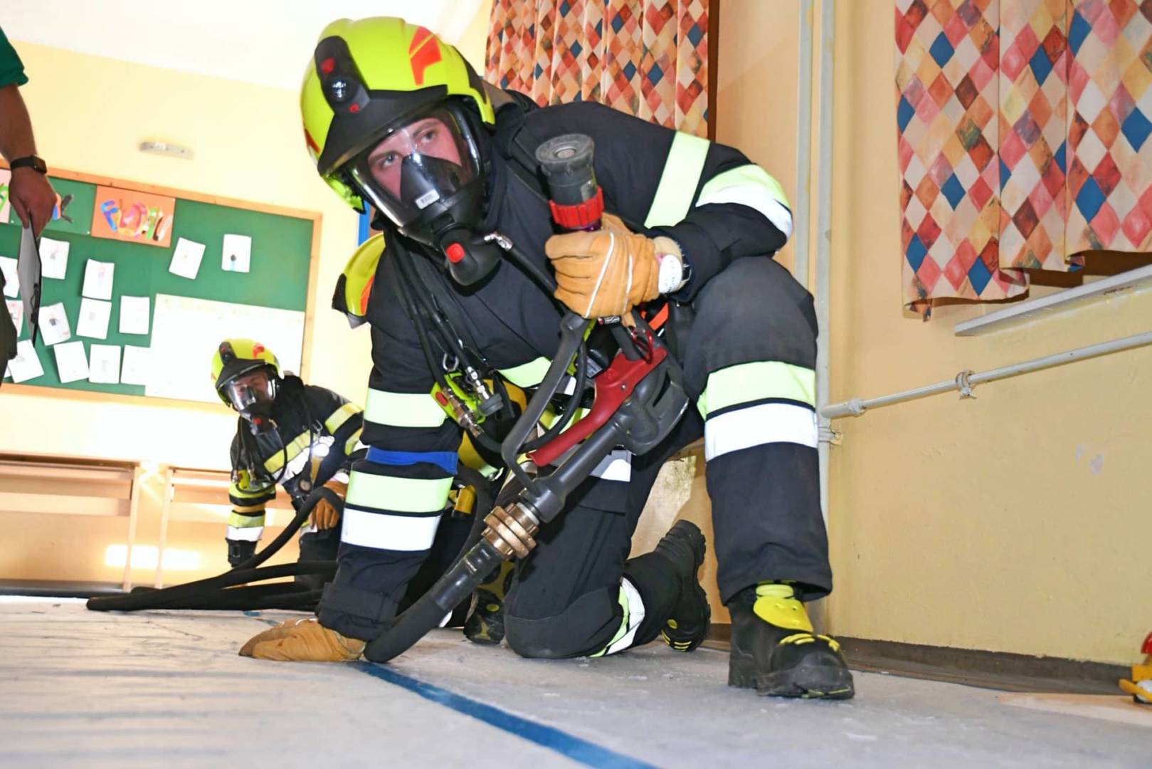 - Station 4: Simulierter Innenangriff. Im 2. Obergeschoss wird ein Brand angenommen, dieser muss vom Atemschutztrupp mit dem Hochdruckrohr bekämpft und gelöscht werden.