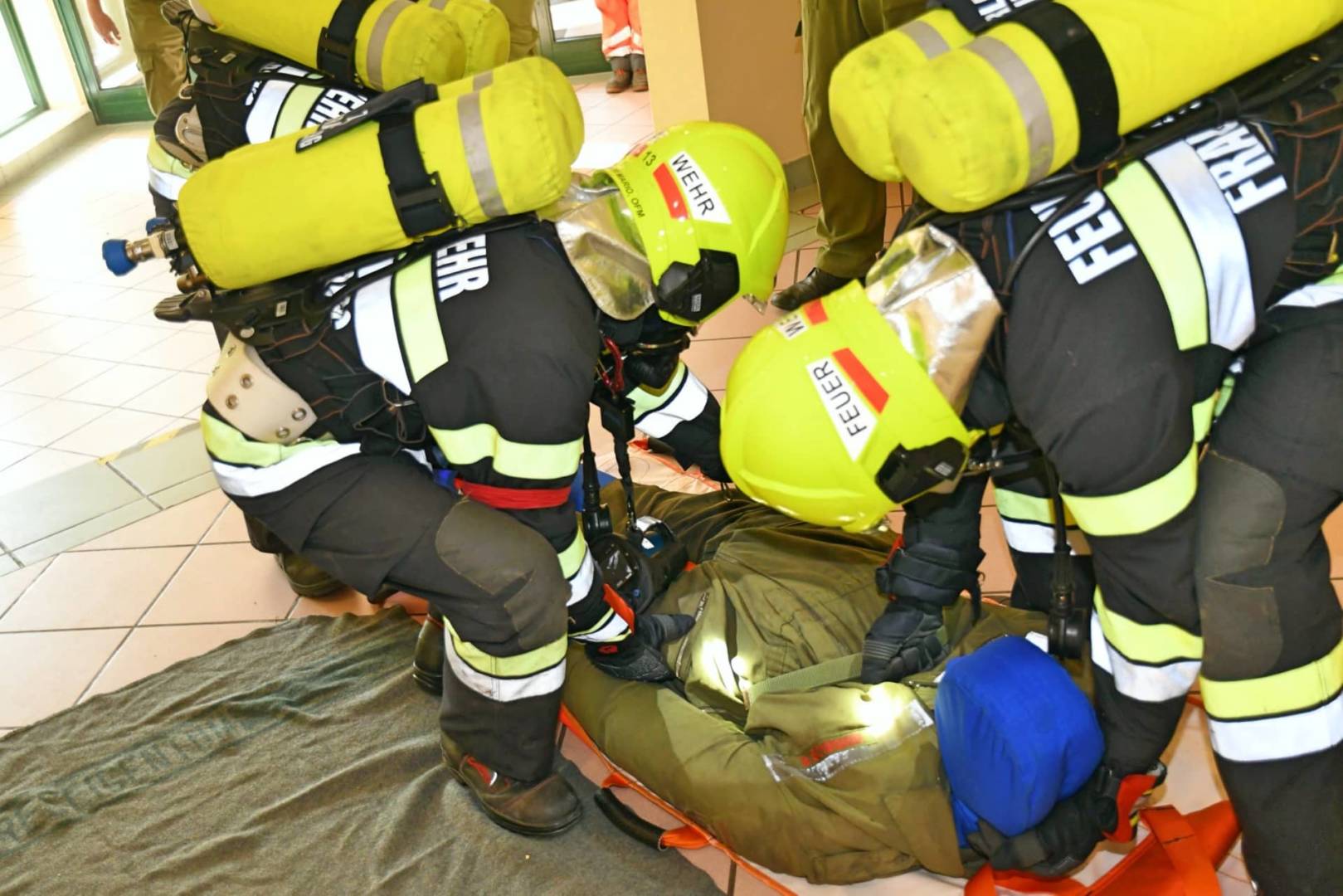 - Station 3: Simulierte Menschenrettung. Ein „Dummy“ (Lebendgewicht) muss aus einem nicht sicheren Bereich mit Hilfe des Tragetuchs vom Atemschutztrupp gerettet werden