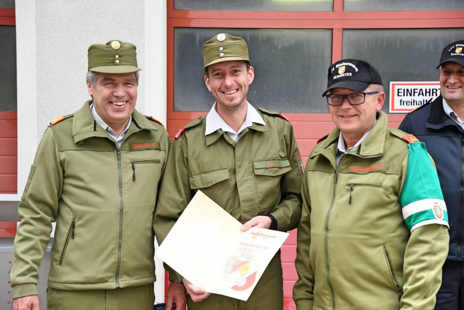 Die Schlusskundgebung der Atemschutz-Leistungsprüfung 2019 in Wörschach, war weiters durch zwei Besonderheiten geprägt: HLM Christian Sam (FF-Irdning) scheidet nun nach rund 12-jähriger Tätigkeit aus dem Bewerterstab aus, für seine auszeichnenden Leistungen wurde ihm seitens des Bereichsfeuerwehrverbandes eine Dankesurkunde, abgerundet mit persönlichen Worten des Dankes, überreicht.