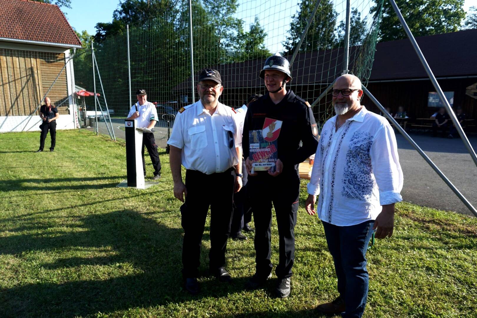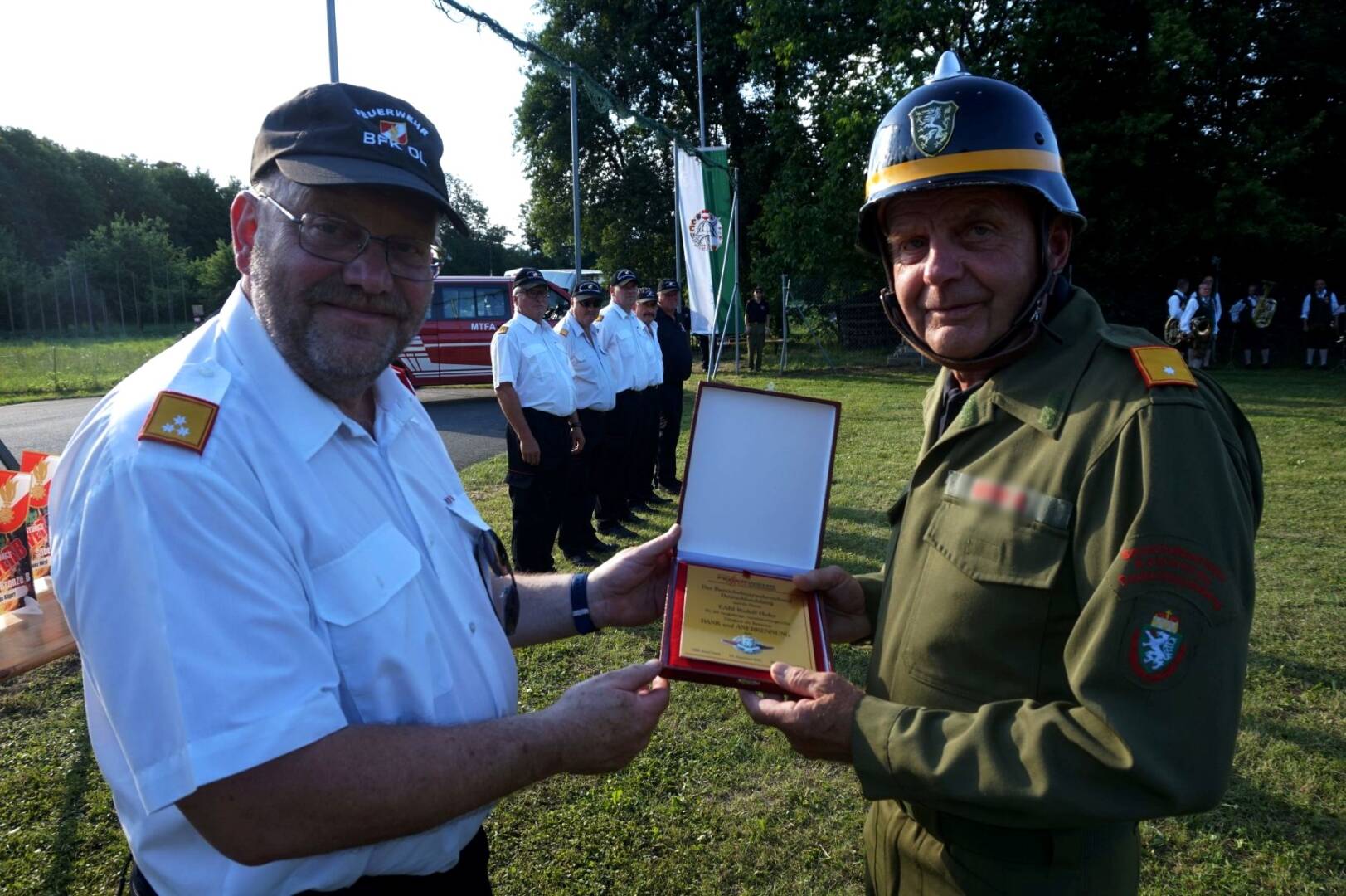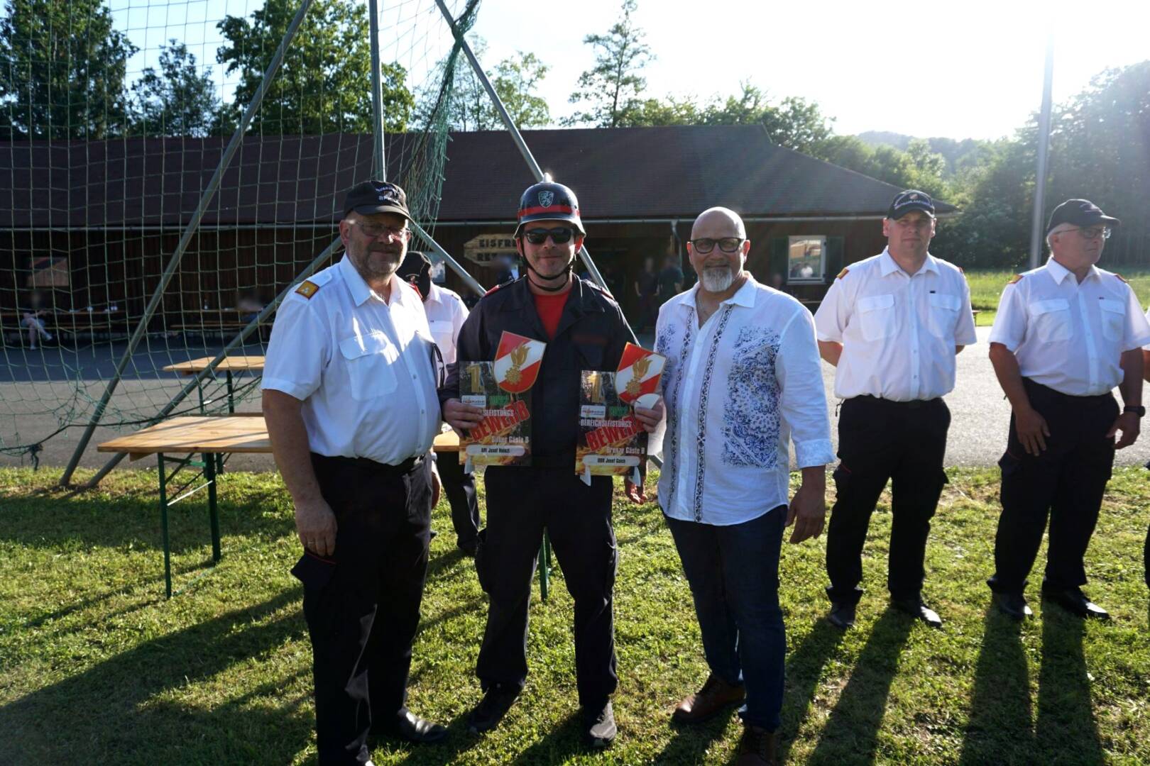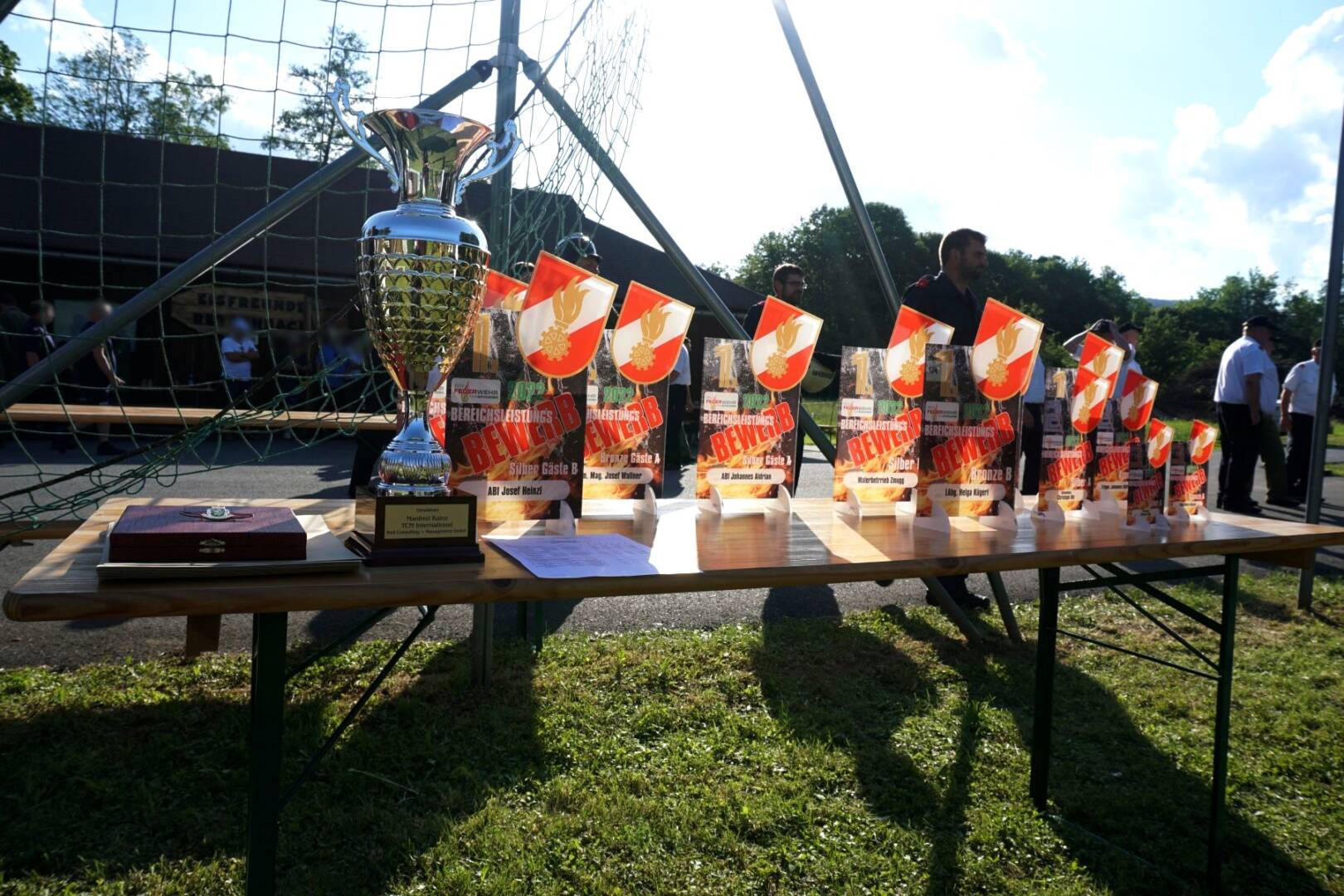 Bevor die eigentliche Siegerehrung begann, standen noch Ehrungen und Auszeichnungen verdienter Kameraden am Programm. OBI Frederik Harkam wurde mit der Bewerterspange in Silber für mehr als 10-malige Bewertertätigkeit ausgezeichnet. EABI Rudolf Hofer wurde als Bewerter verabschiedet und in Zuge dessen wurde ihm ein kleines Andenken für seine langjährige und verdienstvolle Tätigkeit als Bewerter überreicht.