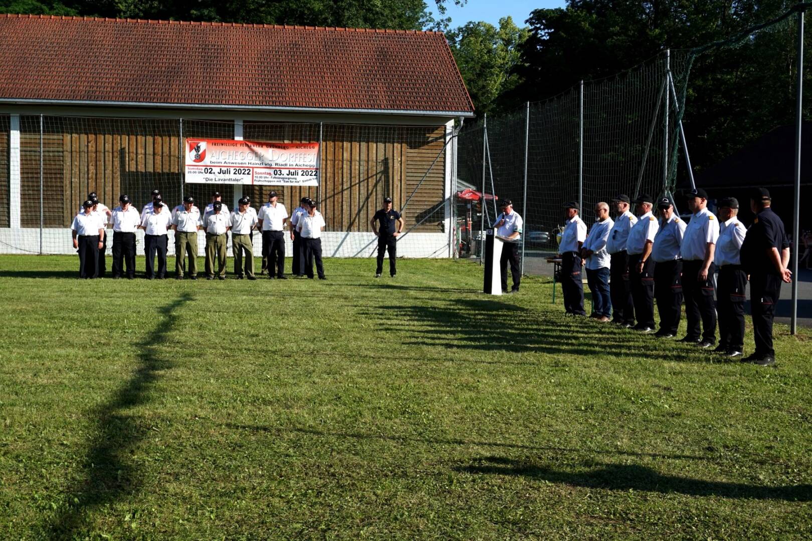 Bewerbsleiter BR d. F. Johann Bretterklieber begrüßte die anwesenden Zuschauerinnen und Zuschauer, sowie die angereisten Bewerbsgruppen aus den Bereichen Deutschlandsberg, Voitsberg, Graz-Umgebung und Weiz. Eröffnet wurde der Bewerb schlussendlich mit der Meldung an den Bereichsfeuerwehrkommandanten OBR Josef Gaich und dem Hissen der Bewerbsfahne. Eine zusammengestellte Bewerbsgruppe aus Kommandanten und Kommandantstellvertretern aus dem Abschnitt 03 Laßnitztal überraschte an diesem Tag ihren ehemaligen Abschnittskommandanten Hofer Rudolf mit der Teilnahme an diesem Bewerb und hatten somit auch die Ehre als erste Gruppe an diesem Tag zu starten.