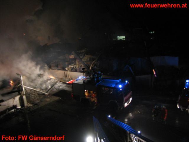 Mit einem massiven Wasserschlag – innerhalb 1 Stunde wurden geschätzte 100.000l Wasser auf das Brandobjekt aufgebracht, bekam man den Brand unter Kontrolle. Mit mehreren B-Rohren wurde dem Feuer von allen Seiten der Kampf angesagt. Besonders bewährt hatte sich hier der Einsatz der 30m Drehleiter Gänserndorf (DLK) mittels Werfermonitor. Die Brandbekämpfung vom Korb der DLK wurde unter schwerem Atemschutz durchgeführt.