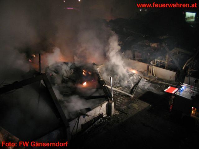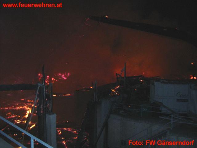 Um 18:00 Uhr nach etwa 2 Stunden stürzte die Halle teilweise in sich zusammen. Die Halle war nun bis auf die Grundmauern niedergebrannt. Der Pendelverkehr mit dem Löschwasser aus den beiden nahegelegensten Gemeinden Spannberg und Matzen war voll angelaufen. Nun begannen die eingesetzten Kräfte mit einem umfassenden Löschangriff.