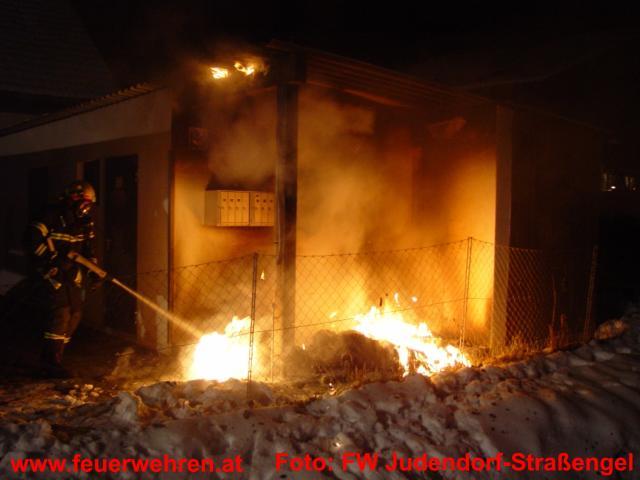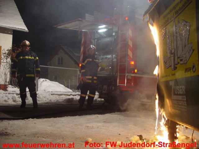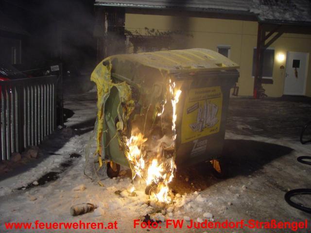 Am Samstag, den 16.01.2010, kam es um 01:20 Uhr in Judendorf-Straßengel zu einem Müllkübelbrand. Die um 01:23 Uhr alarmierte Freiwillige Feuerwehr Judendorf-Straßengel rückte mit 4 Fahrzeugen und 18 Mann zum Einsatzort aus. Der Einsatzbefehl: „Mistkübel droht in der Rötzbachsiedlung auf Carport bzw. auf Siedlung überzugreifen!“
