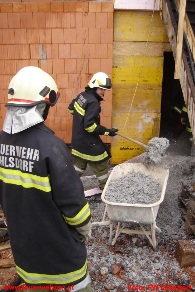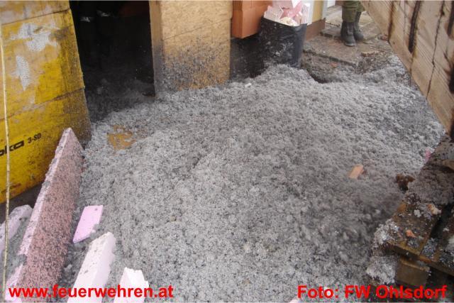Nach dem Eintreffen des Sonderfahrzeuges aus Gschwandt wurde begonnen die Isolierung aus dem Schacht zu entfernen. Dabei musste diese händisch mit leichtem Atemschutz aus der Maueröffnung geschaufelt werden. Von oben her wurde versucht mit dem Hubsteiger das Material nach unten zu stoßen, um so viel wie möglich ausräumen zu können.