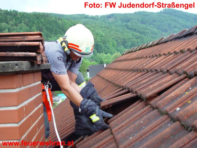 Die Feuerwehr Judendorf-Straßengel, Bezirk Graz-Umgebung, wird am Montag, den 23.05.2011, um 16.14 Uhr durch die Bezirks-Alarmzentrale zu einem Brandeinsatz mit dem Einsatzbefehl „Dachstuhlbrand in der Ringsiedlung“ alarmiert. Während einem kurzen Gewitter, das etwa zwei Stunden zuvor über Judendorf-Straßengel zieht, sucht sich ein Blitz seinen Weg über den Kamin und das Dach eines Wohnhauses in der Ringsiedlung in Judendorf-Straßengel. Nachdem die herabgefallenen Dachteile etwa zwei Stunden später von den Hausbewohnern entdeckt werden und man dadurch auf den Brand am Dachstuhl stößt, beginnen die Personen mit einem Gartenschlauch die erste Löschhilfe.