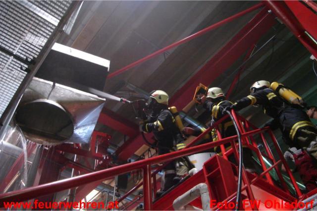 Am Einsatzort wurde der Einsatzleiter bereits von Firmenmitarbeitern erwartet und darüber informiert, dass eine Schrederanlage in Brand geraten war. Von Firmenmitarbeitern wurde die betroffene Anlage mittels Wasser geflutet. Unter schwerem und leichtem Atemschutz drangen ein Atemschutztrupp und ein Firmenmitarbeiter in die Halle vor und konnten mit Hilfe einer Wärmebildkamera den Brandherd schnell lokalisieren.