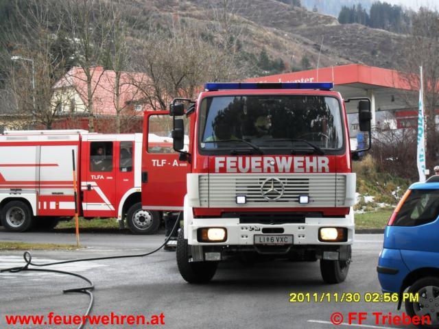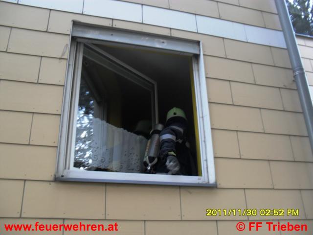 Am 30.11.2011 um 13:36h wurde die FF Trieben Stadt zu einem Zimmerbrand mit eingeschlossener Person alarmiert. Die Stadtfeuerwehr rückte unter Einsatzleiter OBI Markus Parteder mit TLFA 4000, LF und DLK 30 zum Einsatzort ab.
