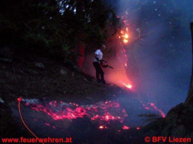 Das Wasser wird vom Speicherteich Riesneralm geflogen, die Feuerwehrmänner graben händisch das Erdreich um, um Glutnester abzusticken. Problem ist lt. Staffelkommandant BI Josef fritz, dass die Glutnester metertief im Erdreich sitzen.