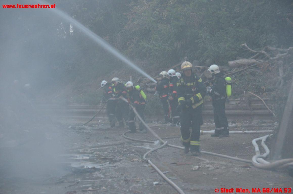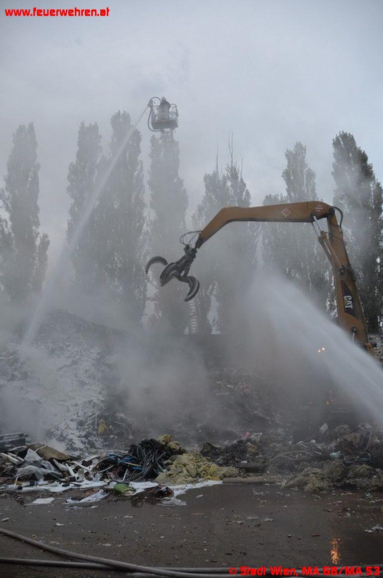 Bei Ankunft der Feuerwehr standen bereits große Teile davon in Brand. Aufgrund der Beschaffenheit des Brandgutes war es notwendig, das Material mit einem Bagger zu zerteilen und Stück für Stück abzulöschen, was die Dauer des Einsatzes erklärt. Zur Löschwasserversorgung wurden Hydranten verwendet und parallel dazu zwei etwa 500 Meter lange Zubringleitungen vom Donaukanal hergestellt.