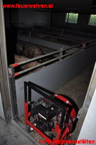 Da der Strom und damit die Standardbelüftung für die Schweine auf Grund des Brandes ausgefallen waren, war die Gefahr auch nach der Entrauchung noch nicht gebannt. Aus diesem Grund wurden auch noch die Feuerwehren Groß St. Florian und Wettmannstätten nachalarmiert, um die weitere Belüftung für alle Schweine mit gesamt vier Hochleistungslüftern sicherzustellen.