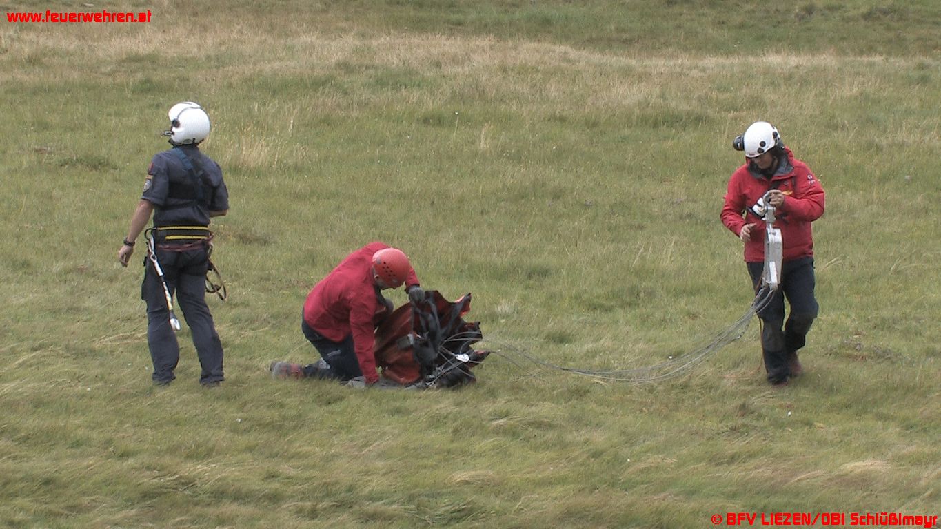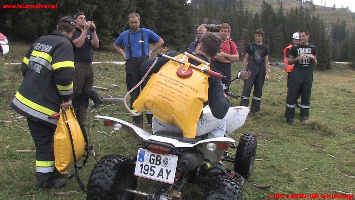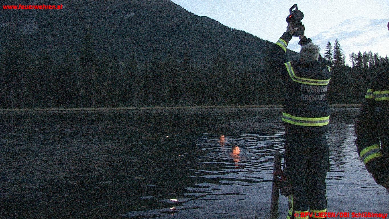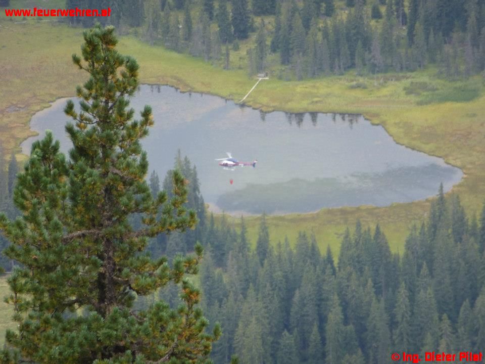 Zwei beherzte Feuerwehrmänner der FF Gröbming, BM Christoph Habacher und LM Jürgen Lerchegger sprangen in den „Miesbodensee“, um den Löschbehälter zu bergen. Die Suche musste aufgrund der Dunkelheit allerdings ergebnislos abgebrochen werden, die beiden tapferen Männer konnten den mit Schlangen und Blutegeln vollen Moorsee wieder verlassen und sich von den ungeliebten Tierchen befreien. Bei der anschließenden Nachbesprechung und Verpflegung in der Ritzinger-Hütte (Viehbergalm) wurde seitens Einsatzleiter ABI Gerd Bartl und BI Ing. Josef Fritz beschlossen, am nächsten Tag die Lage neu zu beurteilen und die Brandbekämpfung fortzusetzen.