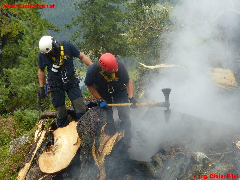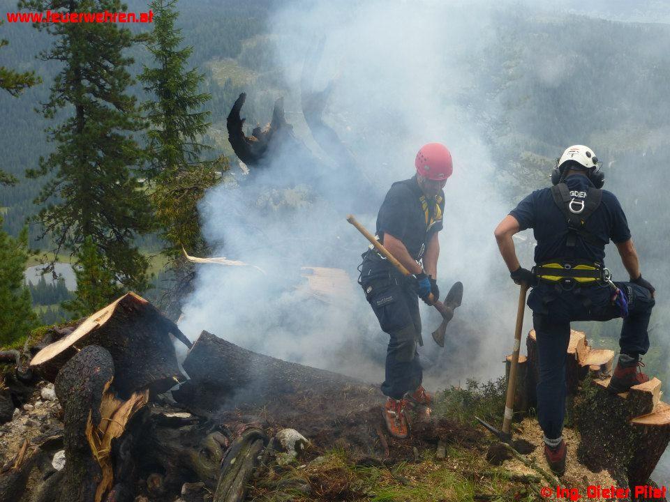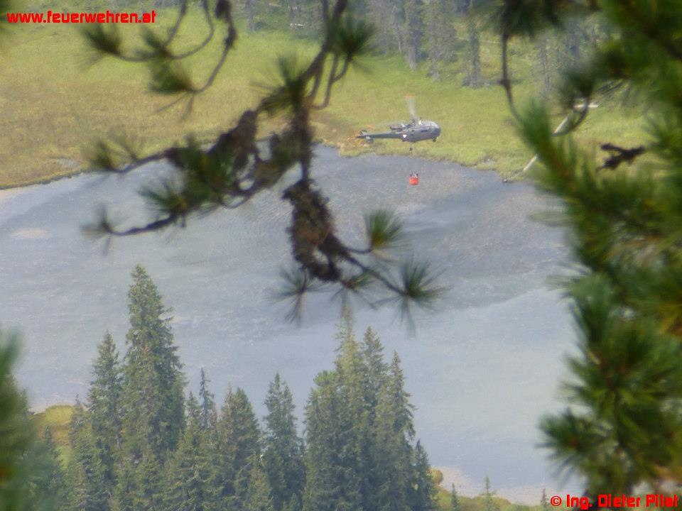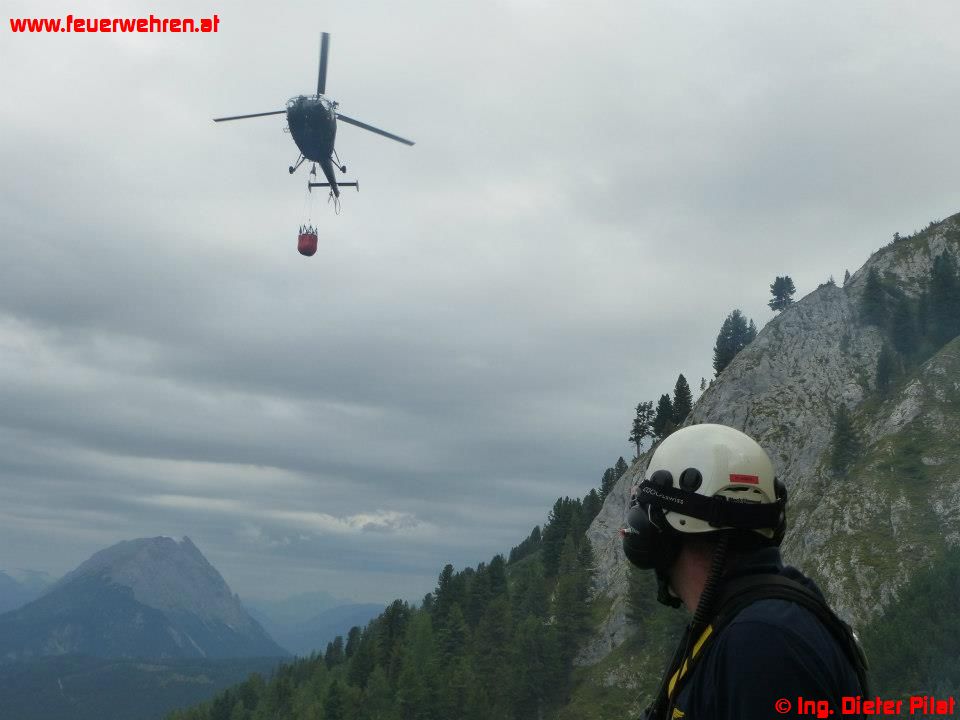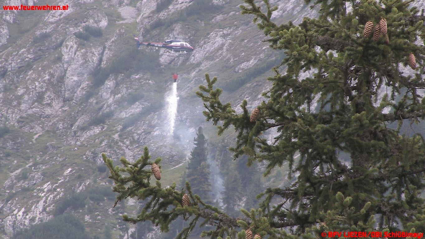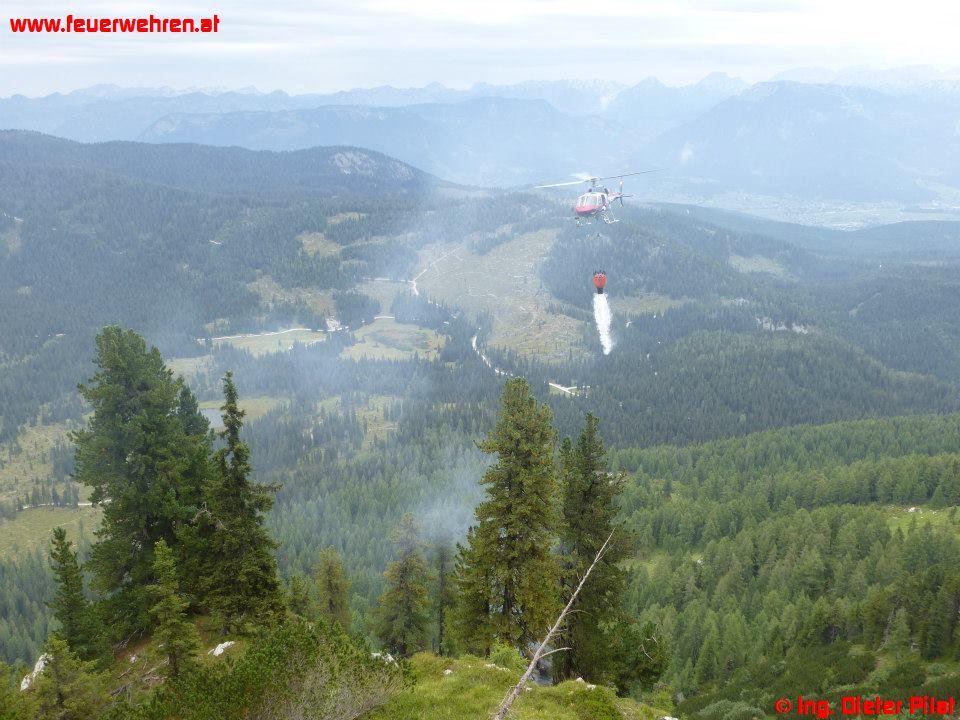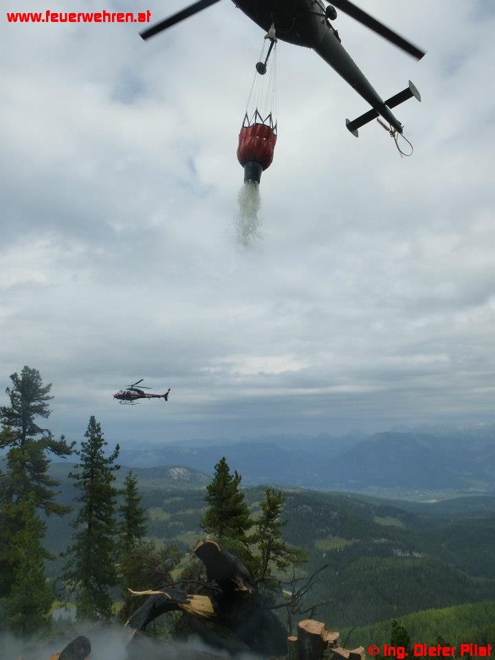 Die Maschine des BMI landete mit dem Landesflugdienstbeauftragten BR Ing. Dieter Pilat am Einsatzort. Nach kurzer Lagebesprechung wurde ein Trupp der Waldbrandgruppe zum Brandherd geflogen. Danach startete die Brandbekämpfung aus der Luft mittels Hubschrauber, auch mit einer mittlerweile eingetroffenen Alouette-III des Bundesheeres. Parallel dazu füllte die Feuerwehr die Löschrucksäcke beim Miesbodensee und transportierte diese mit einem Quad zum Landeplatz. Mit diesen wurde die Brandbekämpfung durch die abgesetzte Mannschaft vorgenommen. Um 15:12 Uhr konnte schließlich „Brand-Aus“ an die Bezirksfeuerwehrzentrale gemeldet werden, um 15:33 Uhr meldeten die Hubschrauber ihre Abflugbereitschaft.
