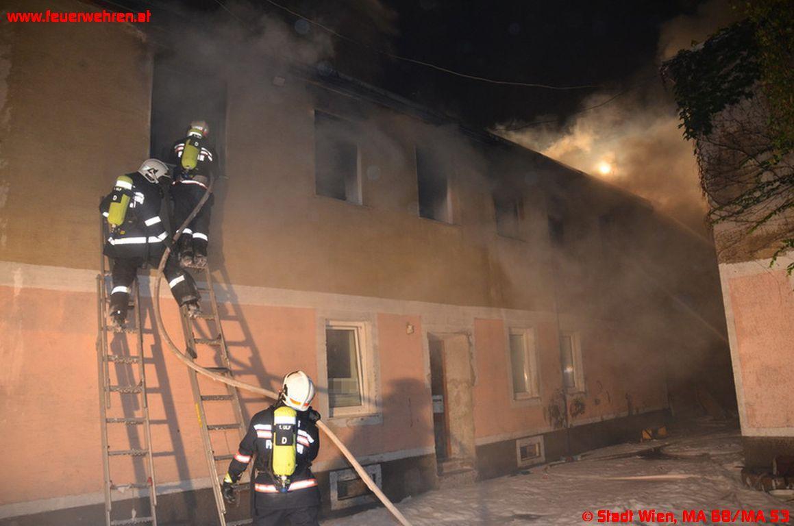 Wien (OTS) – Aus bislang unbekannter Ursache kam es am Dienstag, gegen 1.45 Uhr, in der Heinestraße (2. Bezirk) zum Brand eines zweigeschoßigen Gebäudes. Die Feuerwehr war mit rund 100 Mann im Einsatz. Ein angrenzendes Wohnhaus musste vorübergehend evakuiert werden. Eine Person wurde von der Wiener Rettung (MA 70) mit Verdacht auf leichte Rauchgasvergiftung ins Spital gebracht.