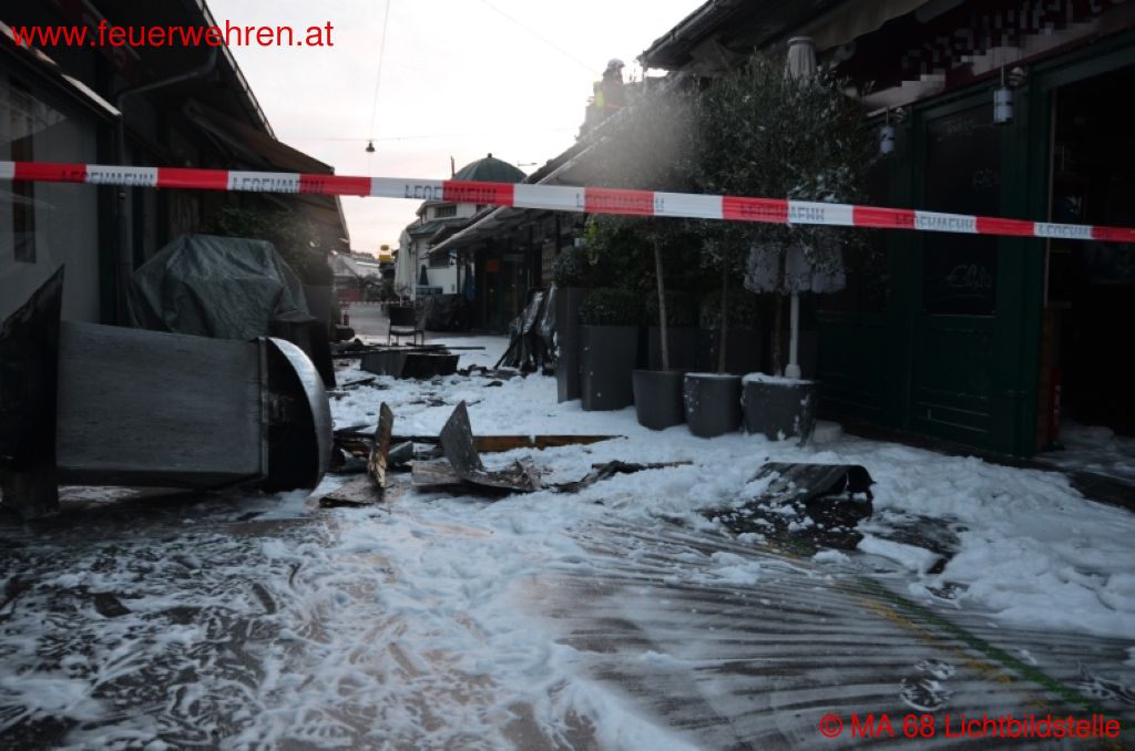 Heute kam es am späten Nachmittag aus unbekannter Ursache zu einem Brand am Naschmarkt. Der Dunstabzug und die dazugehörige Abluftleitung eines asiatischen Restaurants hatten zu brennen begonnen. Zum Zeitpunkt des Brandausbruches befanden sich keine Gäste im Lokal und als die ersten Einsatzkräfte der Berufsfeuerwehr Wien eintrafen, schlugen bereits Flammen aus dem Dach.