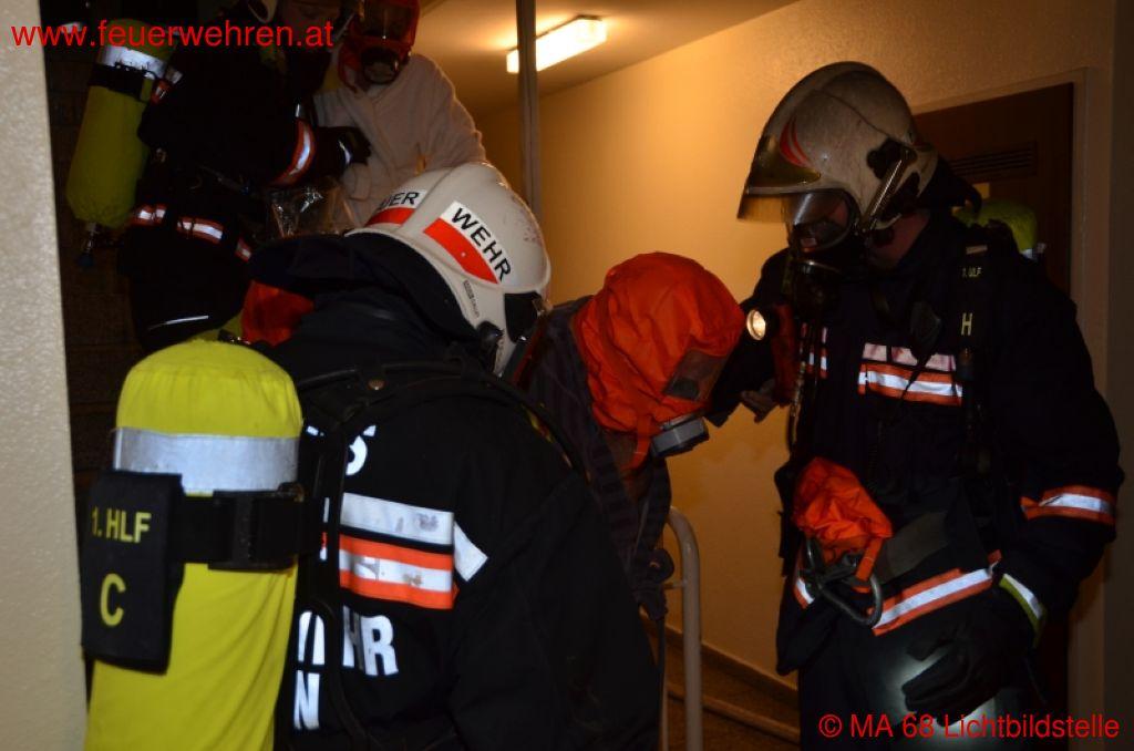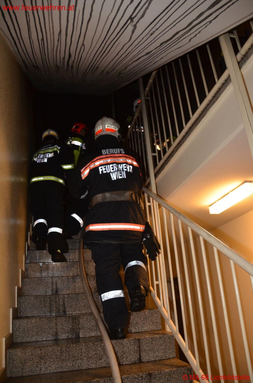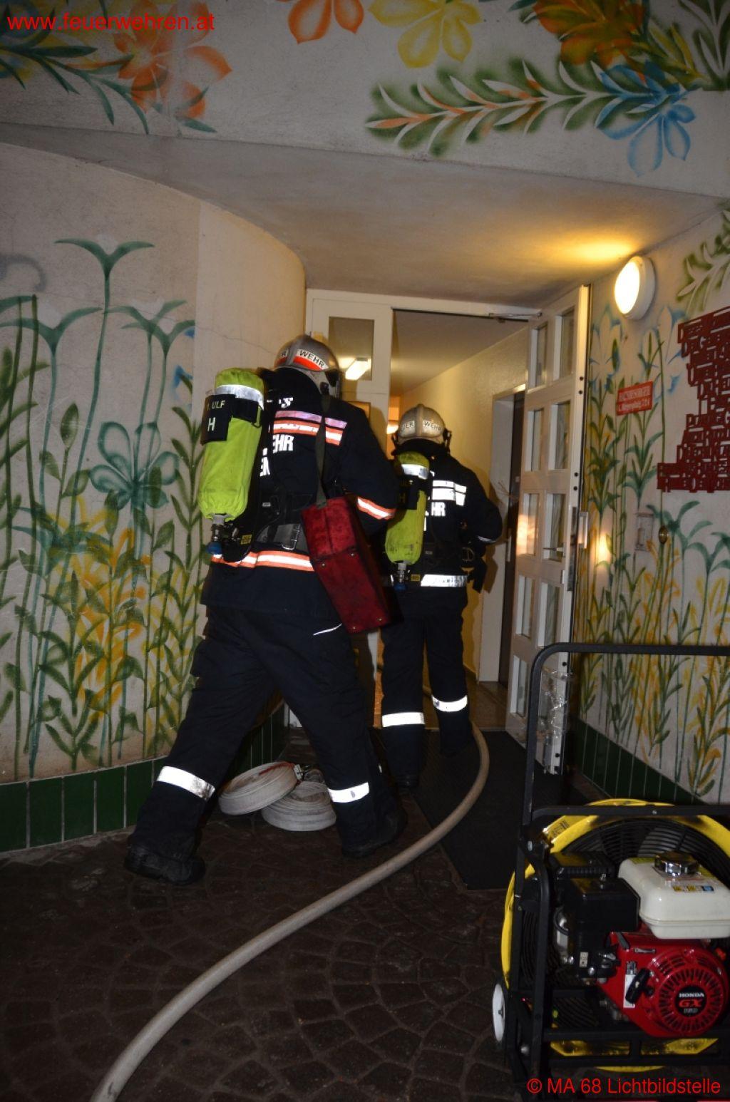 Als kurze Zeit später die ersten Einsatzkräfte der Berufsfeuerwehr Wien am Unglücksort eintrafen, schlugen die Flammen bereits aus einem Fenster an der Rückseite des Gebäudes. Sofort wurden mehrere Löschleitungen vorgenommen und mit der Menschenrettung begonnen. Aufgrund der zahlreichen gefährdeten Personen im sechsstöckigen Haus wurde Alarmstufe zwei ausgelöst und weitere Kräfte an die Einsatzstelle beordert. Während der Brand sowohl von außen als auch von innen durch das Stiegenhaus bekämpft wurde, konnten zwei Personen aus der Brandwohnung geborgen werden. Eine Person davon verstarb trotz sofort eingeleiteter Reanimation noch am Einsatzort und die zweite Person wurde schwer verletzt in ein Krankenhaus gebracht. Parallel zur Brandbekämpfung durchsuchten mehrere Atemschutztrupps die oberhalb der Brandstelle gelegenen Wohnungen und das Stiegenhaus. Dabei wurden zahlreiche Bewohner des Gebäudes mit Fluchtfiltermasken durch die verrauchten Bereiche ins Freie gerettet und an den Katastrophenzug der Berufsrettung Wien übergeben.