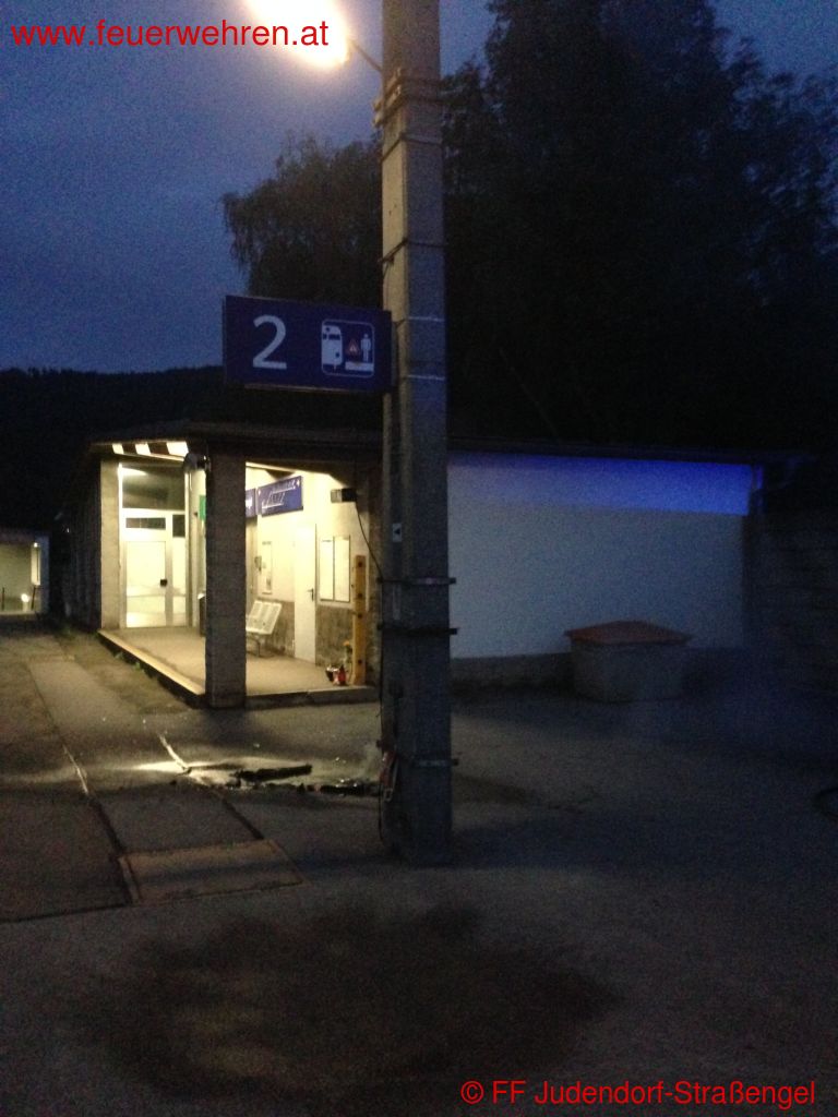 Am 25.09.2013 um 19:08 Uhr rückte die FF Judendorf-Straßengel mit 3 Fahrzeugen und 26 Mann unter der Leitung von ABI Bernhard Konrad zum Einsatzort aus. Nach der Erkundung konnte ein brennender Abfalleimer am Bahnsteig 2 festgestellt werden. Da keine Gefahr, aufgrund der Oberspannungsleitung der Bahn, für die Einsatzkräfte bestand, wurde der Brand sofort mittels eines Hochdruckrohrs gelöscht.