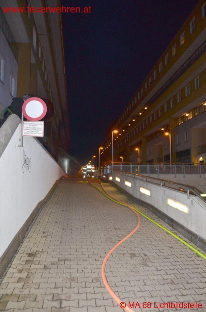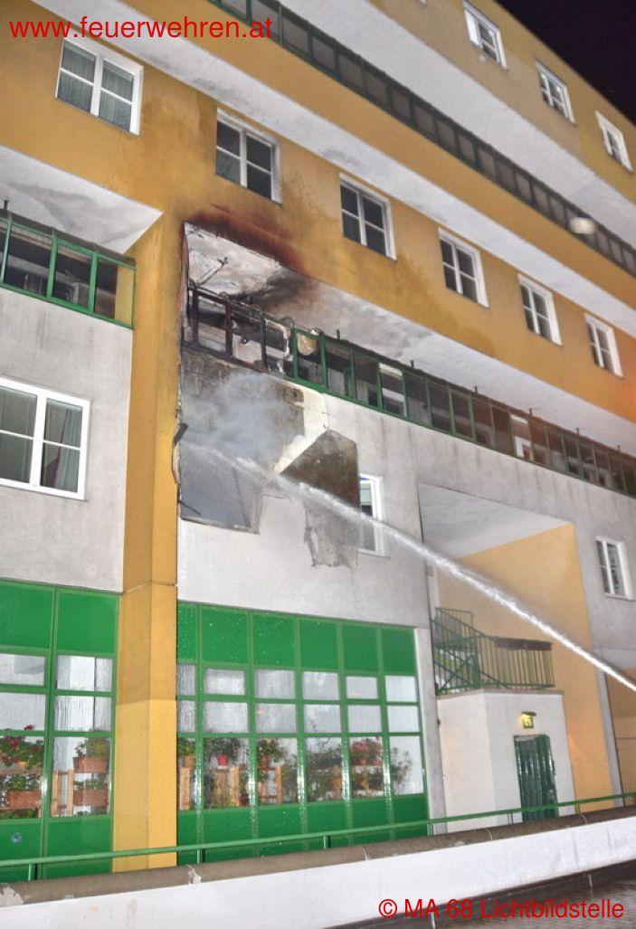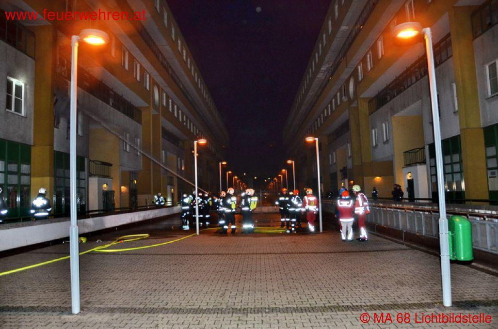 Bei Ankunft der Einsatzkräfte der Wiener Berufsfeuerwehr schlugen aus einem Wohnungsfenster bereits meterhohe Flammen bis auf die Höhe des darüber liegenden Laubenganges. Durch den Brand waren die Wohnung und das Stiegenhaus stark verraucht worden.