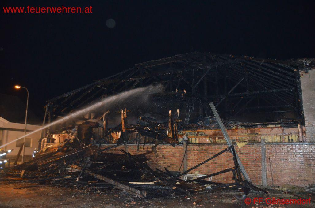 Weiters wurde vom Besitzer angegeben, dass keine Personen mehr im Objekt waren. Die Feuerwehr der Stadt Gänserndorf baute vor Ort sofort die Einsatzleitung auf und ließ durch die ebenfalls alarmierte Feuerwehr Strasshof/Nordbahn einen Atemschutzsammelplatz in Nähe der Bezirkshauptmannschaft Gänserndorf errichten.