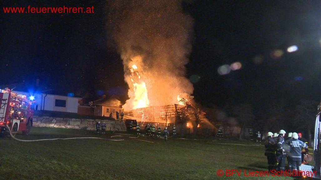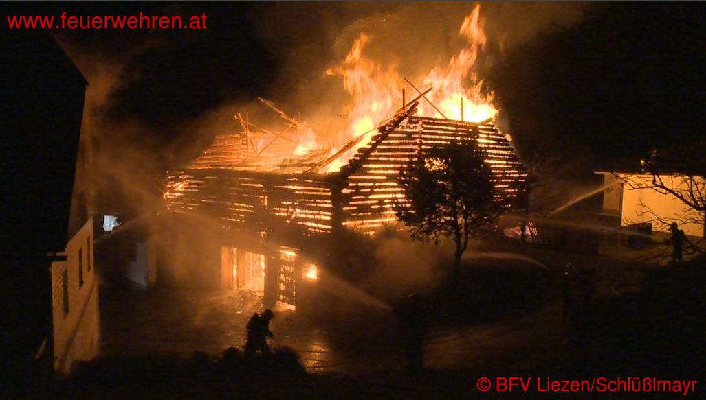 Im Gröbminger Ortsteil Winkl brach heute gegen Mitternacht ein Brand in einem Wirtschaftsgebäude aus; binnen Minuten stand das Stallgebäude aus Holz in Vollbrand.