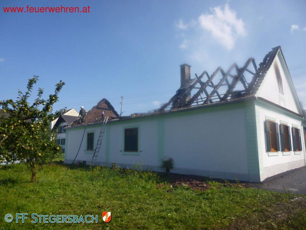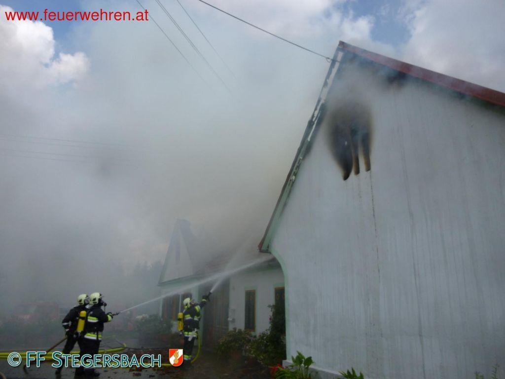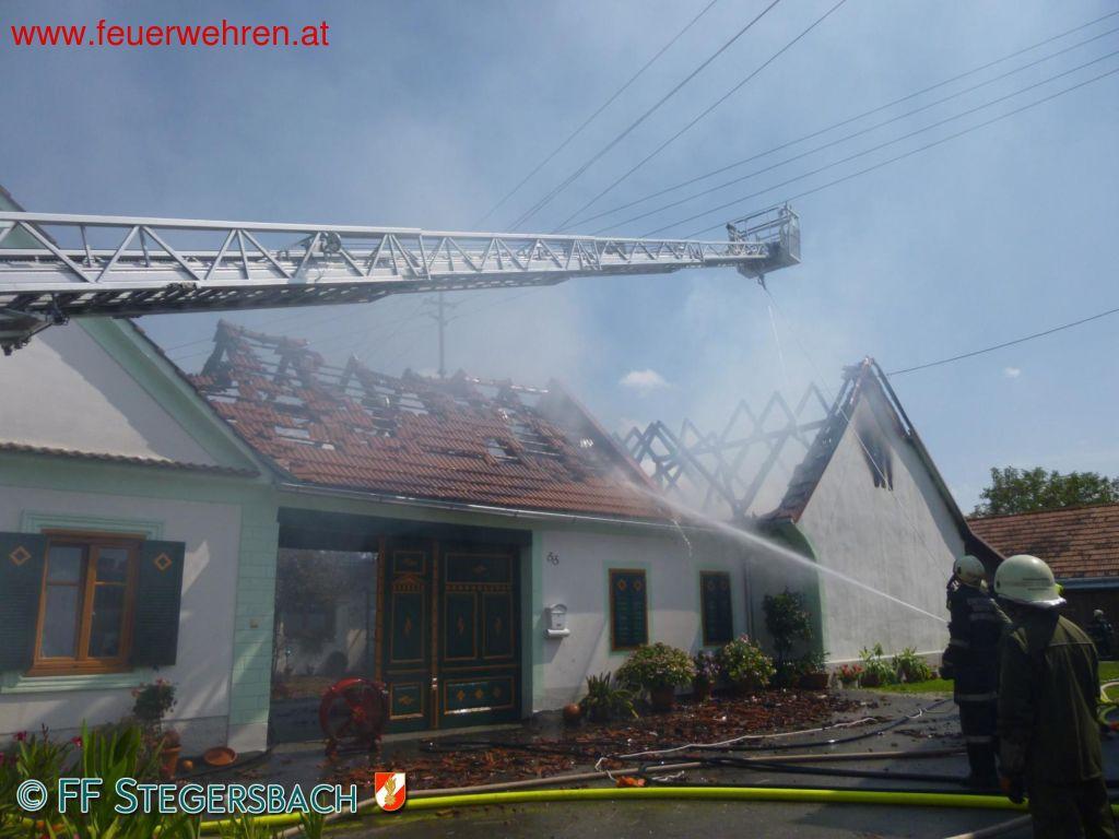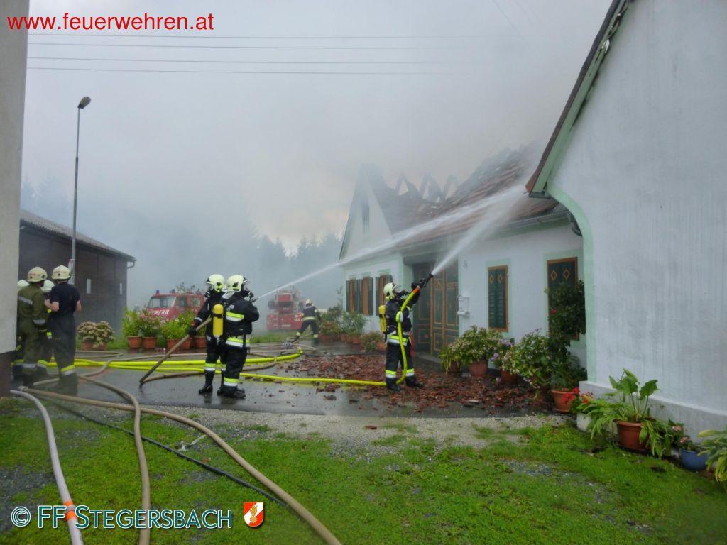 Beim Eintreffen stand der Dachstuhl des Wohngebäudes teilweise in Flammen und der des Wirtschaftsgebäudes in Vollbrand. Mittels Tanklöschwägen wurde ein Pendelverkehr eingerichtet um genügend Wasser vor Ort zu haben. Der Brand wurde von Innen mittels schwerem Atemschutz bekämpft.