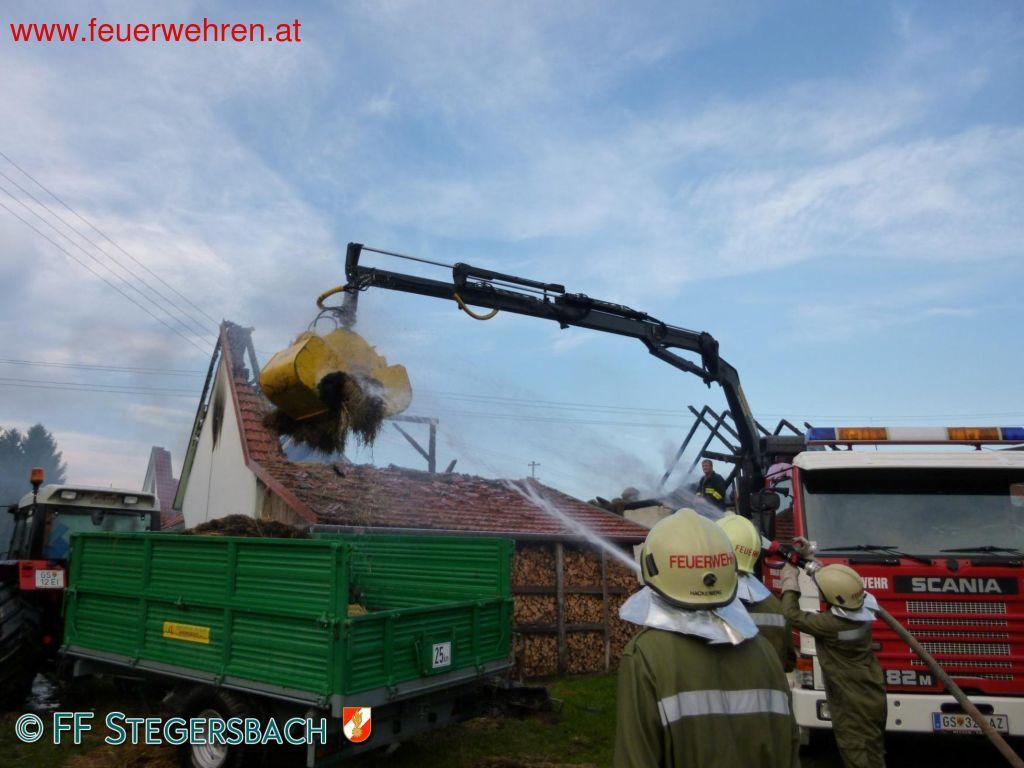 In weiterer Folge wurde mit dem Kranfahrzeug der Feuerwehr Stegersbach das Stroh vom Dachboden gehoben, abgelöscht und abtransportiert. Die Arbeiten dauerten bis in die späten Nachtstunden an.