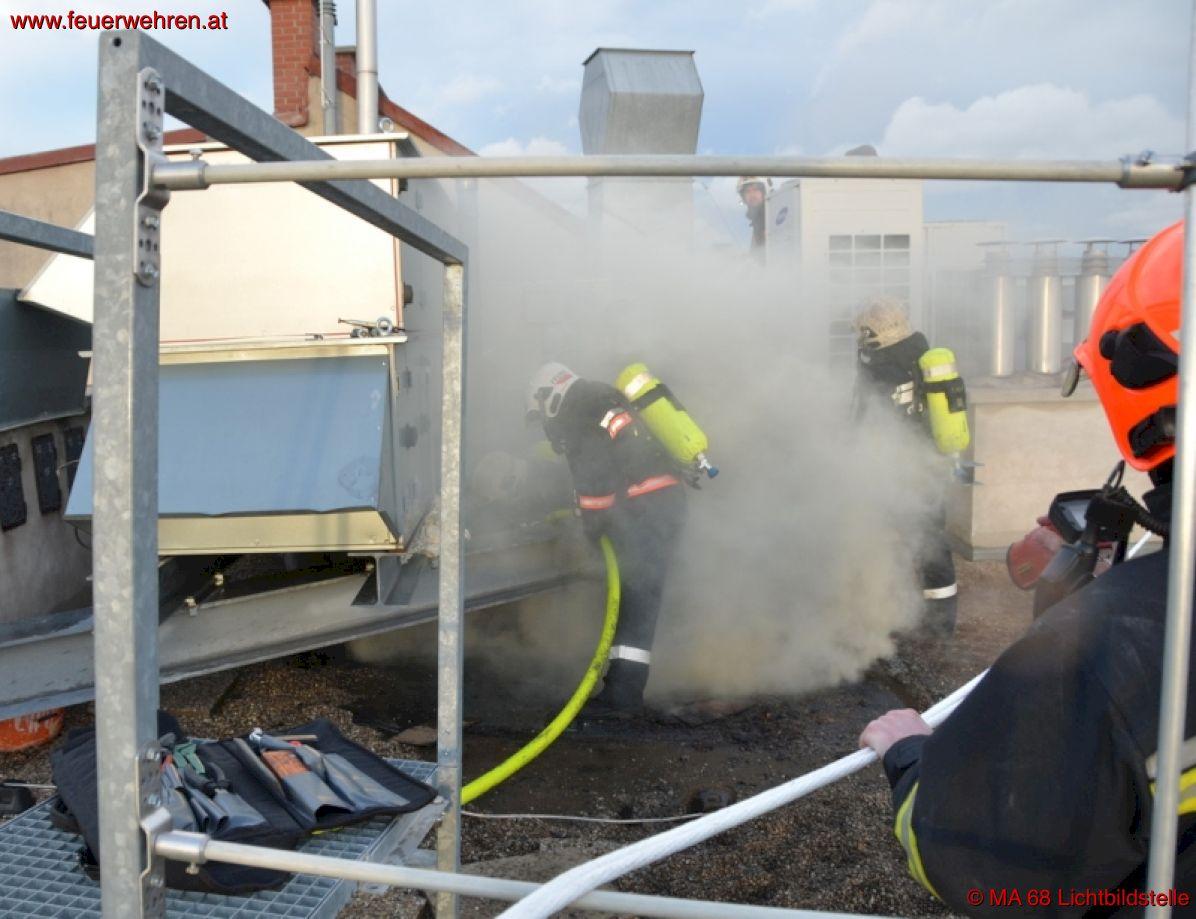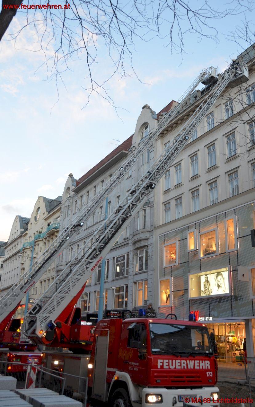 Nach Ankunft der Einsatzkräfte der Berufsfeuerwehr Wien wurde im gesamten Gebäude eine umfangreiche Erkundung durchgeführt, um den Brandherd lokalisieren zu können. Über eine Drehleiter konnte schließlich in der Dachkonstruktion ein Entstehungsbrand festgestellt werden.