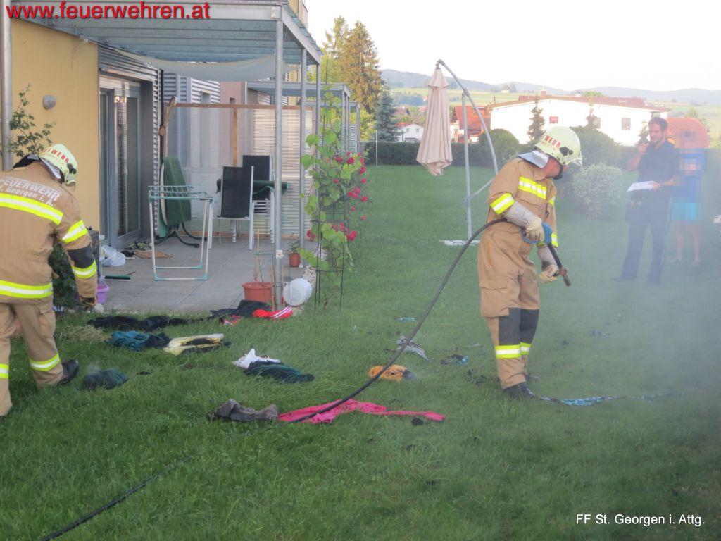 Gestapelte Textilien hatten sich entzündet und wurden von der Feuerwehr aus der Wohnung ausgebracht und anschließend abgelöscht, um einen Wasserschaden im Gebäude zu verhindern.