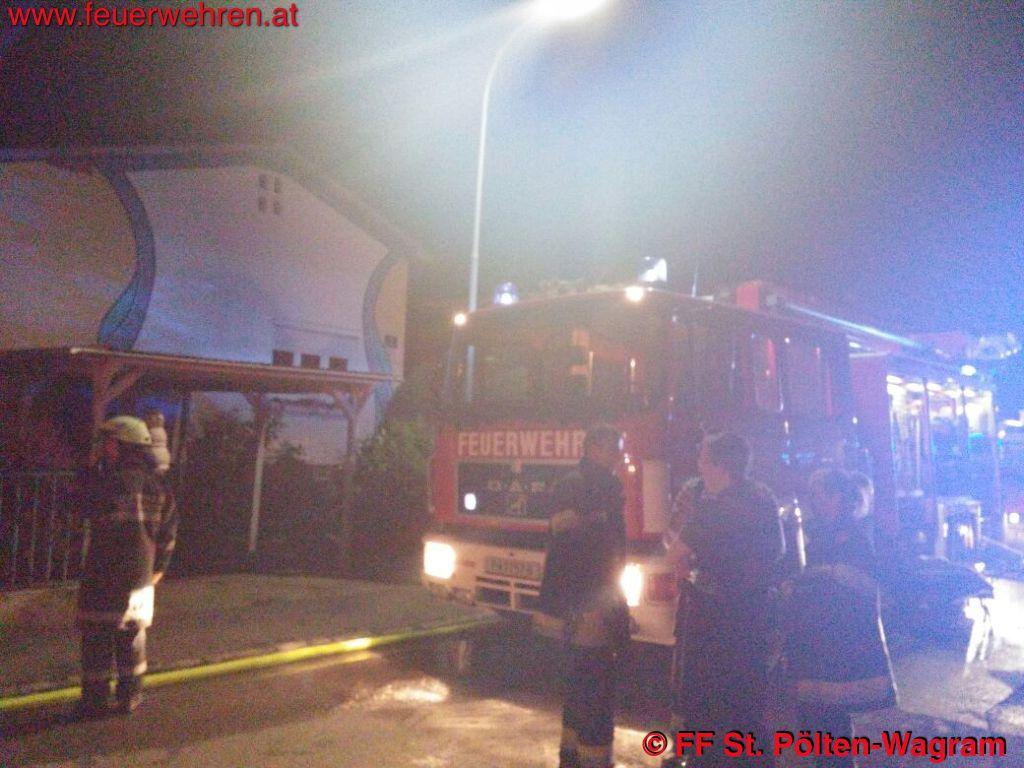 Dazu wurde vom ersteintreffenden Tank 2 der FF St.Pölten-Wagram sofort ein Innenangriff mit der Schnellangriffsleitung unter Atemschutz vorbereitet. Vom zweiten Atemschutztrupp des Tank 1 Wagram wurde wenig später eine zweite Löschleitung in den hinteren Bereich des Wohnhauses vorgenommen. Die mittlerweile ebenso eingetroffenen Fahrzeuge der Nachbarfeuerwehren, Tank 2 und Leiter St.Pölten sowie Tank Stattersdorf stellten jeweils einen Rettungstrupp zur Sicherheit der eingesetzten Atemschutztrupps bzw. blieben in Bereitschaft vor Ort. Der Notarztwagen des Samariterbundes und ein Rettungstransportwagen des Roten Kreuzes waren ebenso vor Ort für die Versorgung eventueller eingeschlossener Personen. Da bald klar war, dass sich keine Personen mehr im Haus befinden, konnte der Notarztwagen und die Drehleiter aus dem Einsatz herausgelöst werden; der Rettungstransportwagen und die Löschfahrzeuge der Feuerwehren St.Pölten-Stadt und St.Pölten-Stattersdorf blieben am Einsatzort.