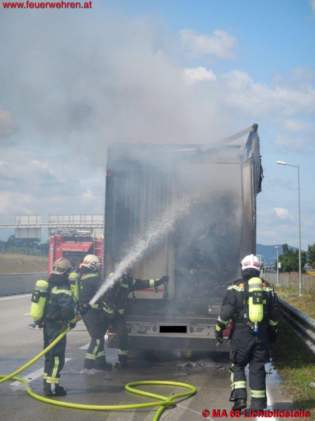 Der Lenker des mit Schrott beladenen Fahrzeuges bemerkte den Brand und verständigte die Feuerwehr. Von der Berufsfeuer Wien wurde der Brand unter Atemschutz lokalisiert, erste Löschmaßnahmen eingeleitet und das Fahrzeug selbst mit einem speziellen Abschleppfahrzeug für LKWs von der Schnellstraße geschleppt.