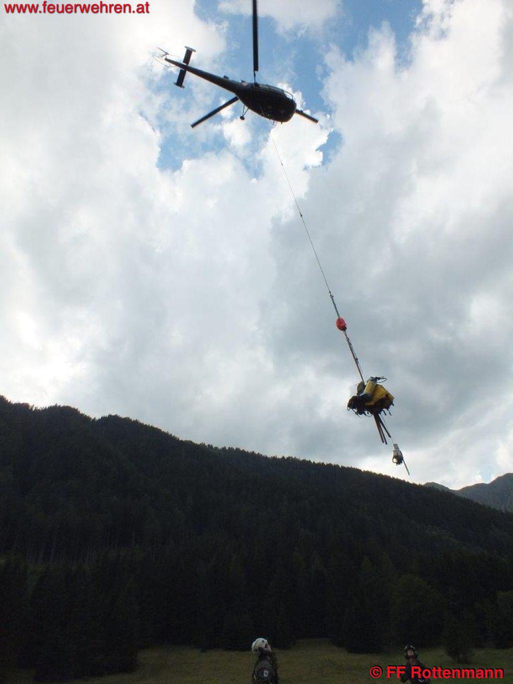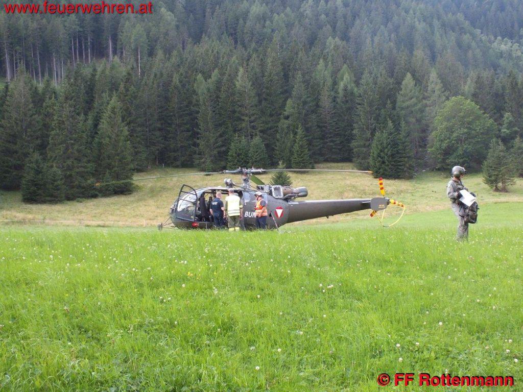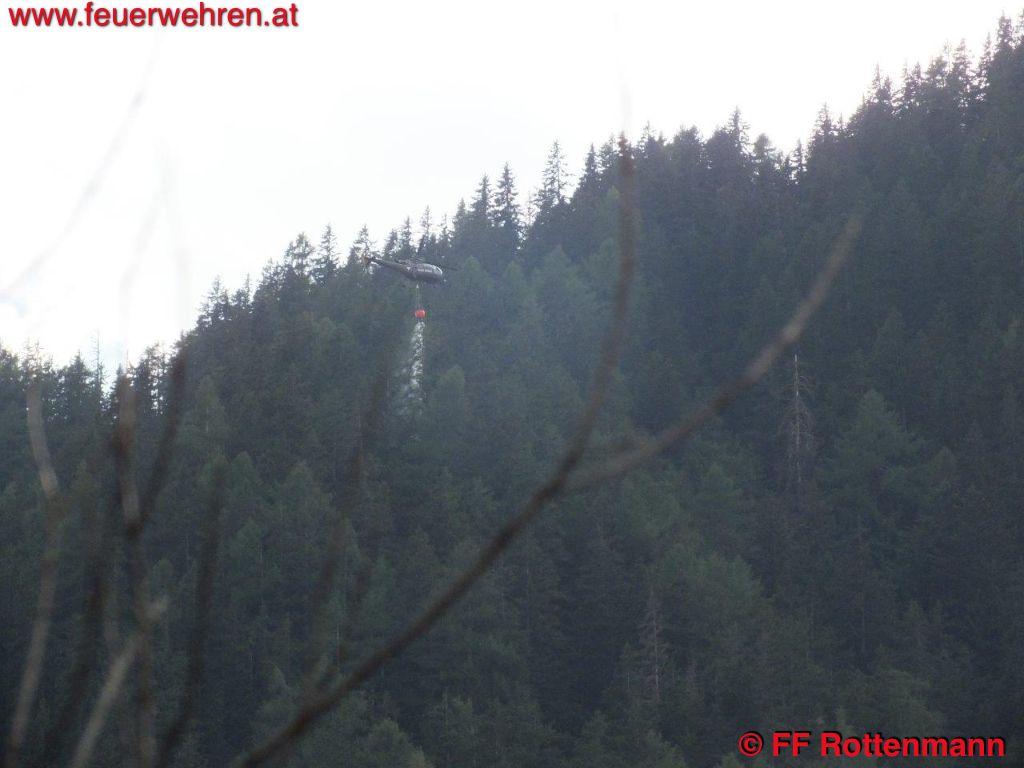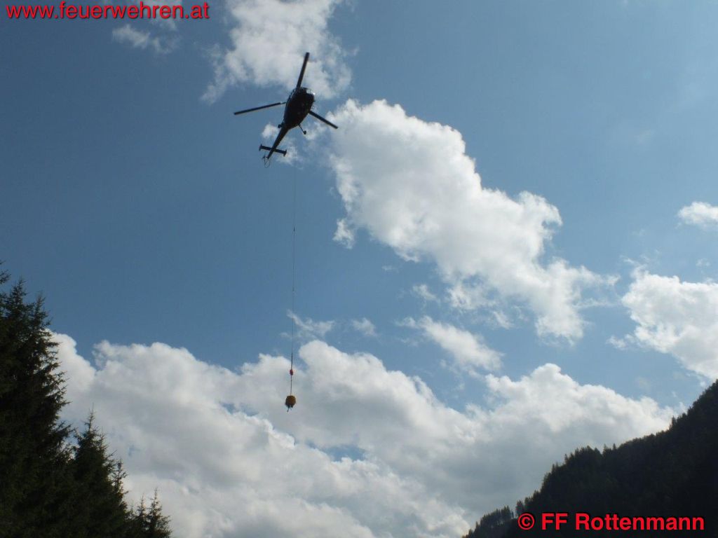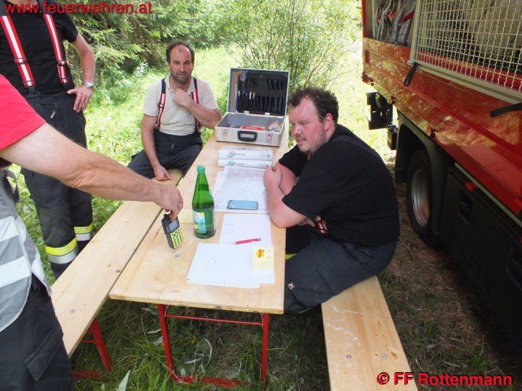 TLFA und LKWA Rottenmann waren nach kurzer Zeit in Oppenberg am Einsatzort, die Flugdienststaffel FF Aigen traf kurze Zeit später ein. Es wurde eine starke Rauchentwicklung im steilen Gelände ausgemacht, keinerlei Zugang über Forstwege. Ein Förster und zwei Holzarbeiter waren bereits in der Nähe des brennenden Waldstückes, sie hatten Feuerlöscher dabei. Nach Koordination mit dem Flugdienstbeauftragten OBI Josef Fritz und dem Einsatzleitstab der Feuerwehr Rottenmann, der von BR Heinz Hartl und ABI Franz Haberl unterstützt wurde, konnte ein geeigneter Standort als Landeplatz für den Hubschrauber ausgemacht werden. Kurz darauf traf auch schon eine Maschine des Heeres am Einsatzort ein. Nach einem Erkundungsflug mit Einsatzleiter OBI August Gassner und Flugdienstbeauftragten OBI Josef Fritz konnten Ursache des Brandes und Einsatztaktik festgelegt werden. Durch einen Blitzschlag der vergangenen Unwetter entstand ein Brand im Unterholz rund um den betroffenen Baum. Der Flugdienstleiter entschied in Absprache mit dem Einsatzleiter des Bundesheeres, drei Mann der Flugdienststaffel hochzufliegen um die erste Brandbekämpfung mit Feuerlösch-Rucksäcken durchzuführen. Des Weiteren wurde ein direkter Löscheinsatz mittels Hubschrauber weitergeführt, als Aufnahme für das Wasser diente ein nahegelegener Teich. Die Hauptaufgaben der FF Rottenmann waren die Koordinierung der Einsatzkräfte, die Wasserversorgung durch das Tanklöschfahrzeug und die Sicherstellung des Nachschubes.