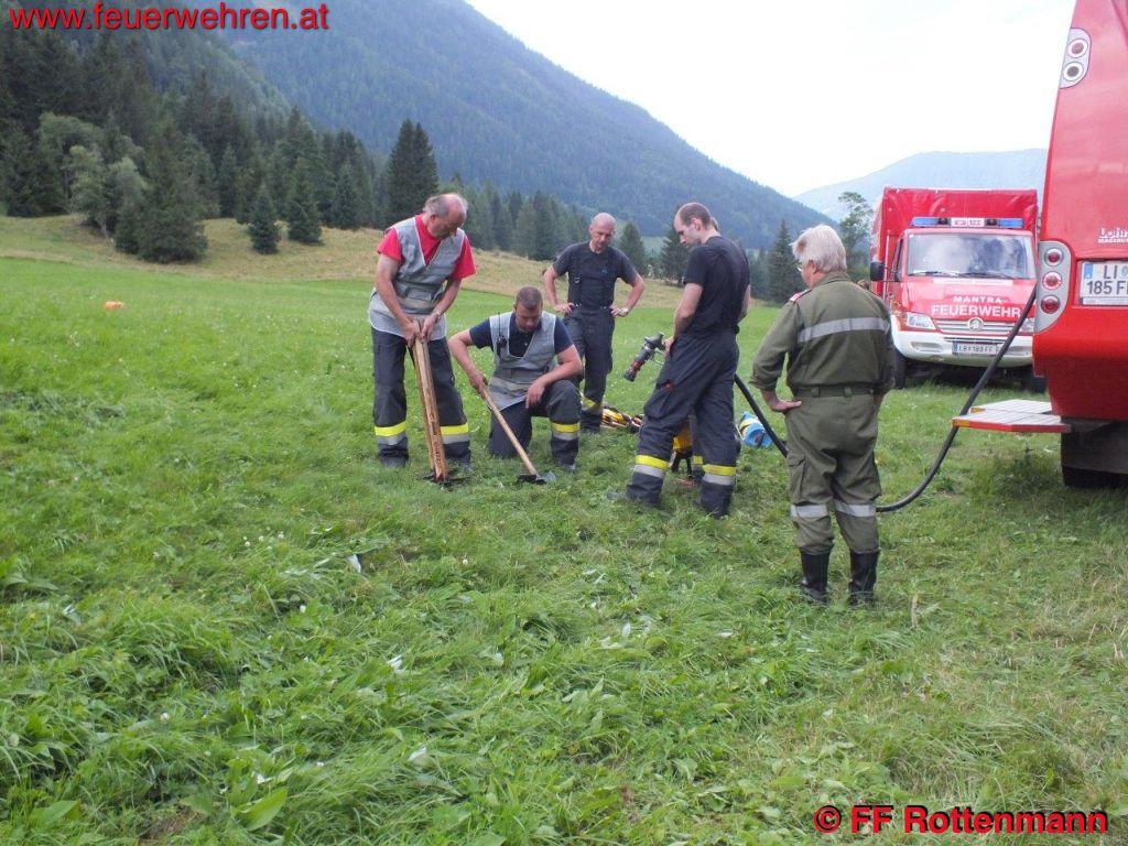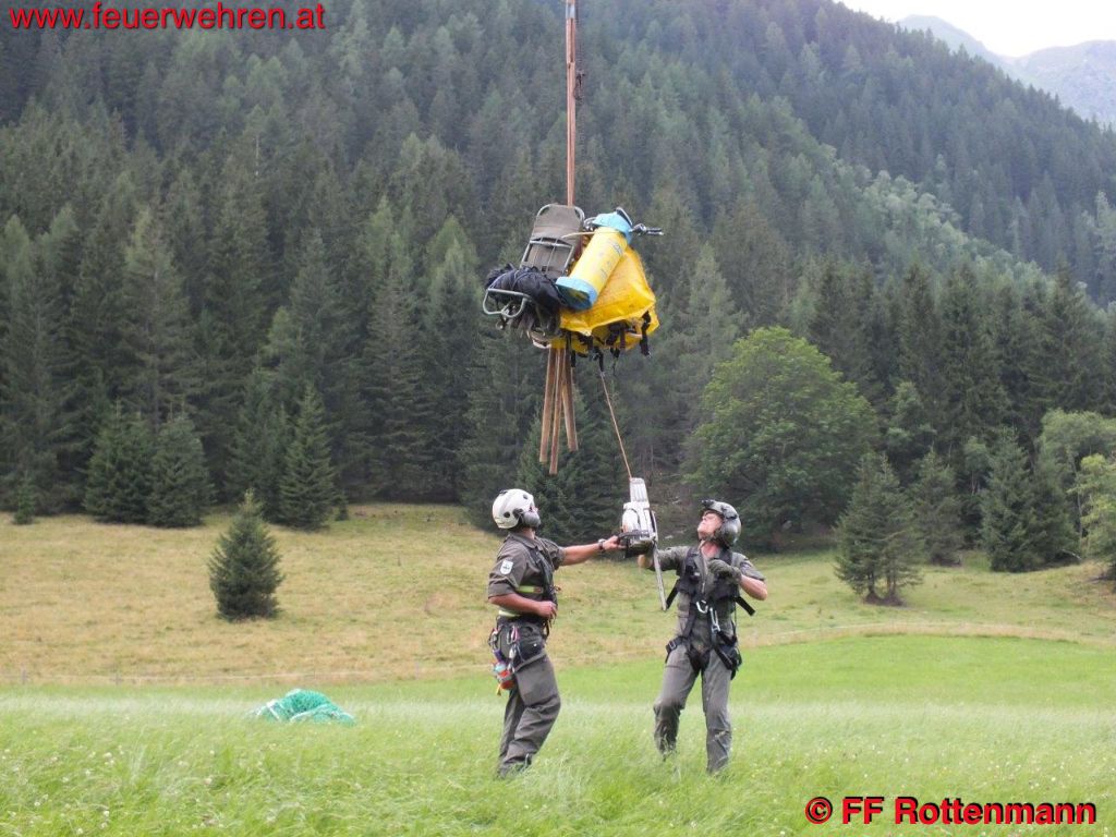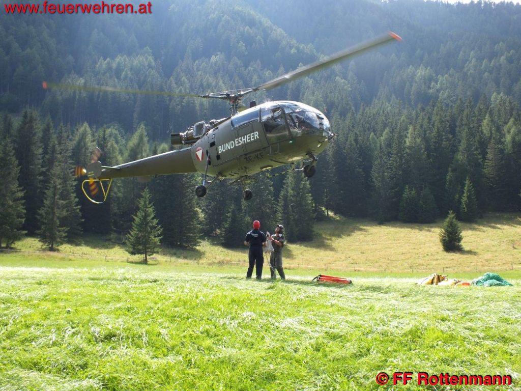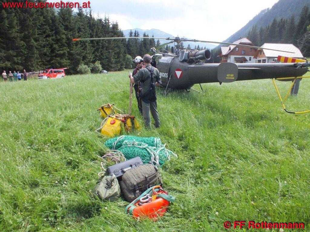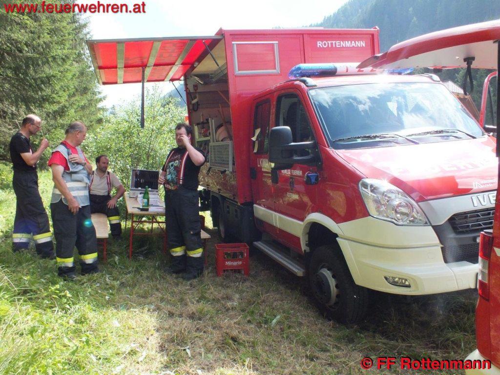 TLFA und LKWA Rottenmann waren nach kurzer Zeit in Oppenberg am Einsatzort, die Flugdienststaffel FF Aigen traf kurze Zeit später ein. Es wurde eine starke Rauchentwicklung im steilen Gelände ausgemacht, keinerlei Zugang über Forstwege. Ein Förster und zwei Holzarbeiter waren bereits in der Nähe des brennenden Waldstückes, sie hatten Feuerlöscher dabei. Nach Koordination mit dem Flugdienstbeauftragten OBI Josef Fritz und dem Einsatzleitstab der Feuerwehr Rottenmann, der von BR Heinz Hartl und ABI Franz Haberl unterstützt wurde, konnte ein geeigneter Standort als Landeplatz für den Hubschrauber ausgemacht werden. Kurz darauf traf auch schon eine Maschine des Heeres am Einsatzort ein. Nach einem Erkundungsflug mit Einsatzleiter OBI August Gassner und Flugdienstbeauftragten OBI Josef Fritz konnten Ursache des Brandes und Einsatztaktik festgelegt werden. Durch einen Blitzschlag der vergangenen Unwetter entstand ein Brand im Unterholz rund um den betroffenen Baum. Der Flugdienstleiter entschied in Absprache mit dem Einsatzleiter des Bundesheeres, drei Mann der Flugdienststaffel hochzufliegen um die erste Brandbekämpfung mit Feuerlösch-Rucksäcken durchzuführen. Des Weiteren wurde ein direkter Löscheinsatz mittels Hubschrauber weitergeführt, als Aufnahme für das Wasser diente ein nahegelegener Teich. Die Hauptaufgaben der FF Rottenmann waren die Koordinierung der Einsatzkräfte, die Wasserversorgung durch das Tanklöschfahrzeug und die Sicherstellung des Nachschubes.