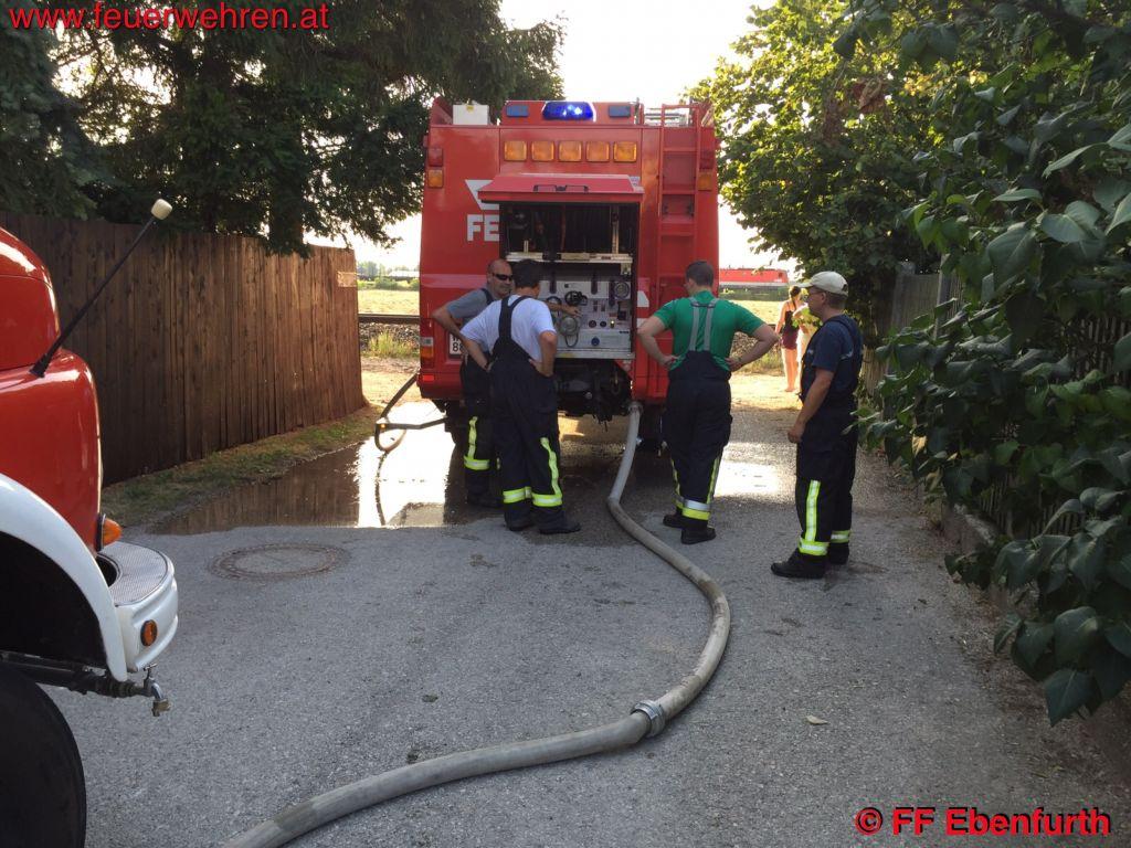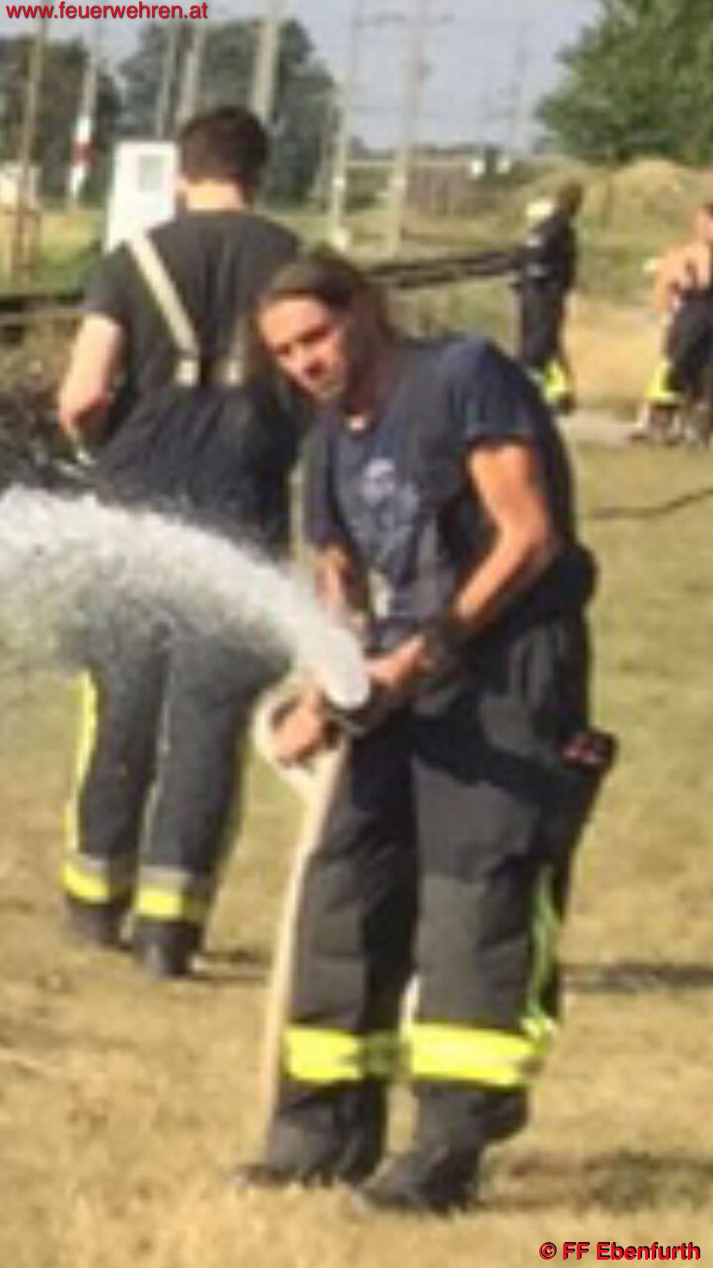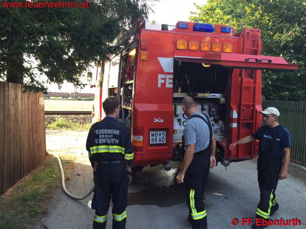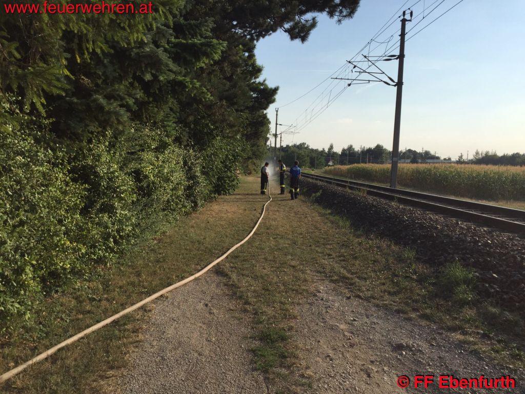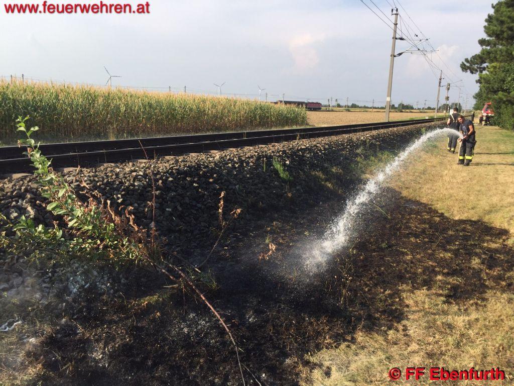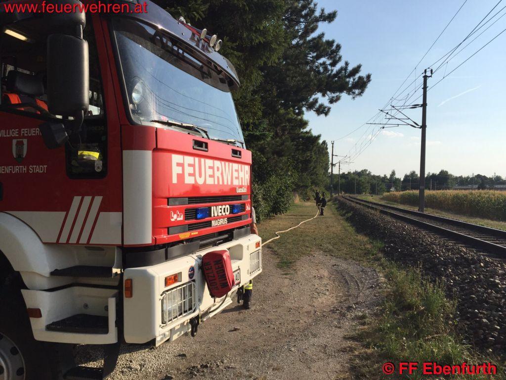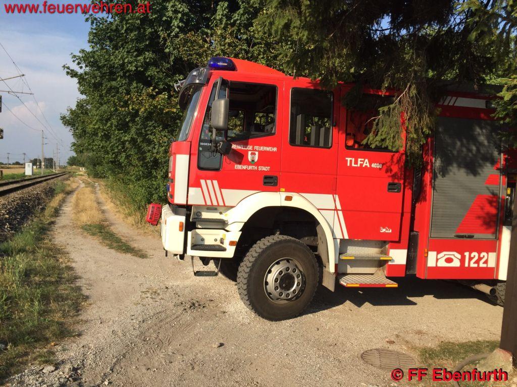 Am Mittwoch den 12. August 2015 um 17:31 Uhr wurden wir zum zweiten Brandeinsatz des heutigen Tages alarmiert. Der Bahndamm im Bereich der Bahnhofseinfahrt Ebenfurth hatte Feuer gefangen. Ein mutiger Anrainer begann mit einem Pulverlöscher und einem Gartenschlauch das Feuer zu bekämpfen und verhinderte so eine Brandausbreitung auf angrenzende Büsche und Hecken. Mittels C-Schnellangriffseinrichtung wurde der Brand endgültig abgelöscht. Von Tank 2 wurde eine Versorgungsleitung zu Tank 1 aufgebaut und mit gesamt 6000 Litern aufgebrachten Löschwasser wird es hoffentlich an dieser Stelle nicht so schnell wieder zu einem Bahndammbrand kommen. Nach ca. einer Stunde war der Einsatz beendet. Ein weiterer Anrainer hat die Getränkeversorgung der eingesetzten Feuerwehrmänner übernommen. Herzlichen Dank!