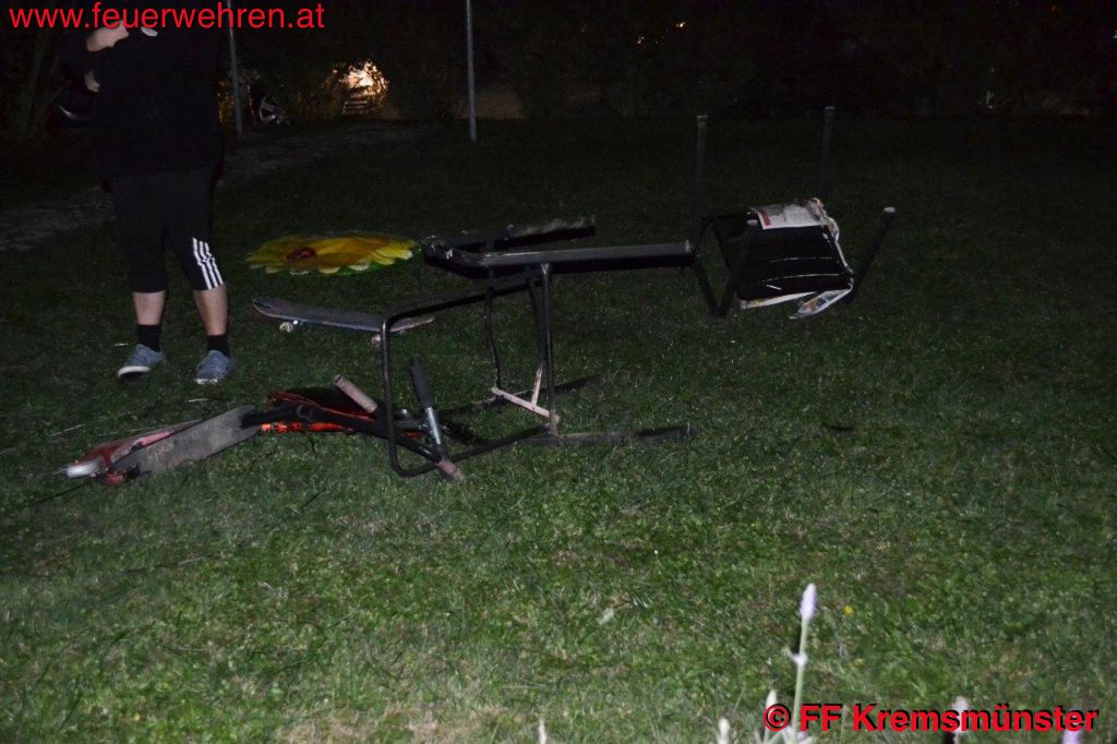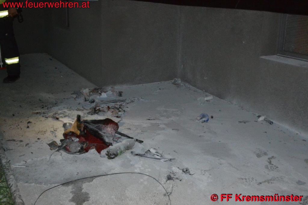 Beim Eintreffen des Einsatzleiters der FF-Kremsmünster konnte rasch Entwarnung gegeben werden. Kinder hatten beim Spielen unterhalb eines Balkons ein Feuer entzündet. Sie löschten es zwar ab, jedoch fingen Teile der Spielsachen und ein Gartensessel wieder zu brennen an.