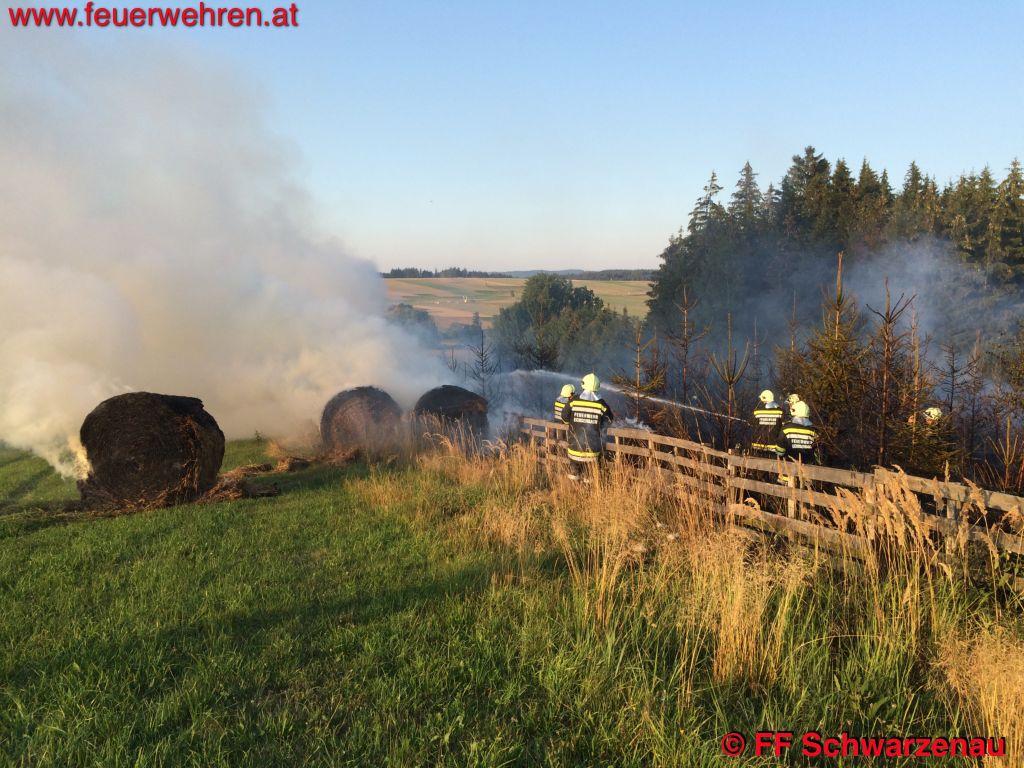 Unmittelbar hinter dem Jungwald waren Strohrundballen gelagert, die ebenfalls in Brand gerieten. Mit Unterstützung des Eigentümers wurden diese Rundballen mittels eines Radladers vom Brandbereich entfernt und auf ein geackertes Feld verbracht.