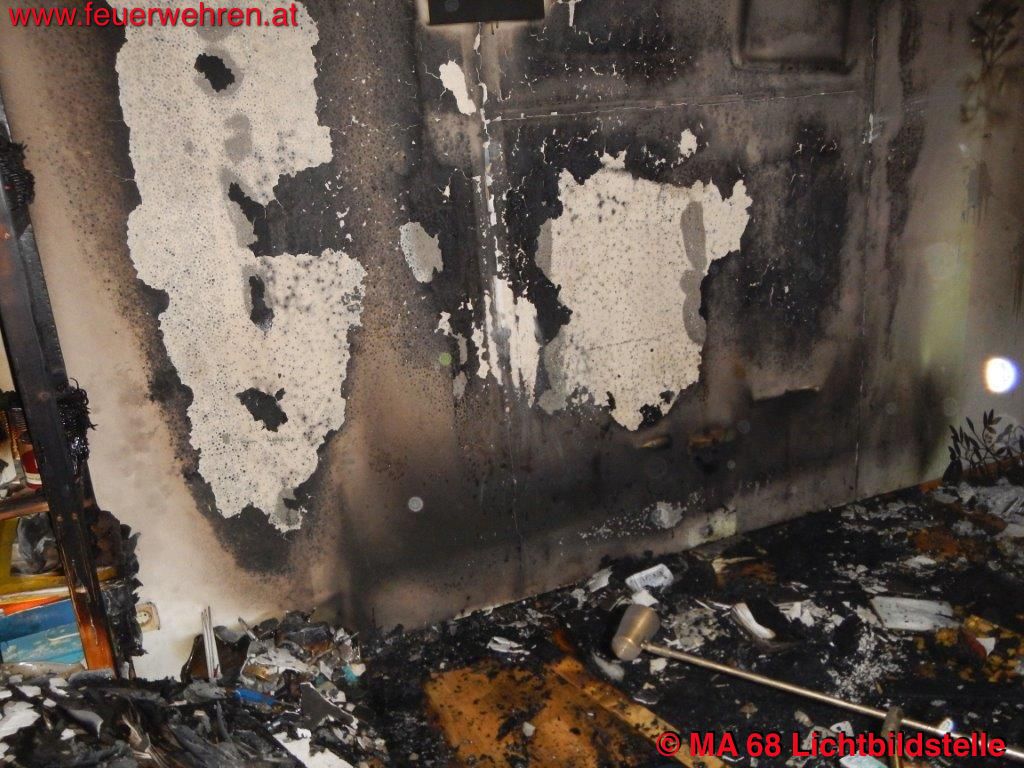 Der im Bereich des Bettes ausgebrochene Brand wurde von der Berufsfeuerwehr Wien mit einer Löschleitung unter Atemschutz abgelöscht. Das leicht verrauchte Stiegenhaus wurde kontrolliert und mit einem Hochleistungsbelüftungsgerät entraucht. Vorsorglich wurde das Brandgut im erforderlichen Ausmaß ausgeräumt und im Freien gesichert abgelegt.