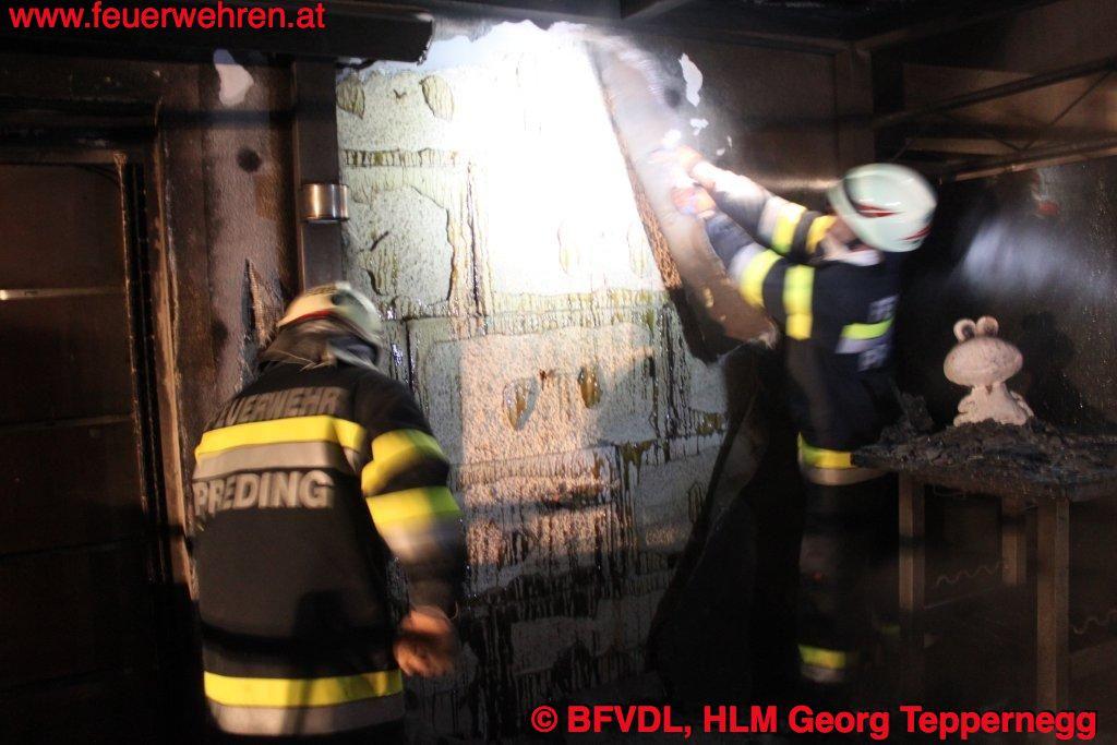 Der Atemschutztrupp der Feuerwehr Preding ging mittels einen Hochdruckrohr zum Brandherd vor. Die Feuerwehr Wettmannstätten und Wieselsdorf stellten einen Atemschutzreservetrupp und bauten eine zweite Löschleitung auf.