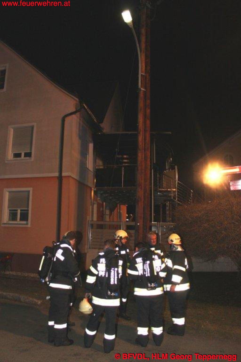 Einsatzleiter OBI Markus Schwarz erkundete die Lage und stellte fest, dass es sich um einen Brand auf einem angebauten Balkon handelt.