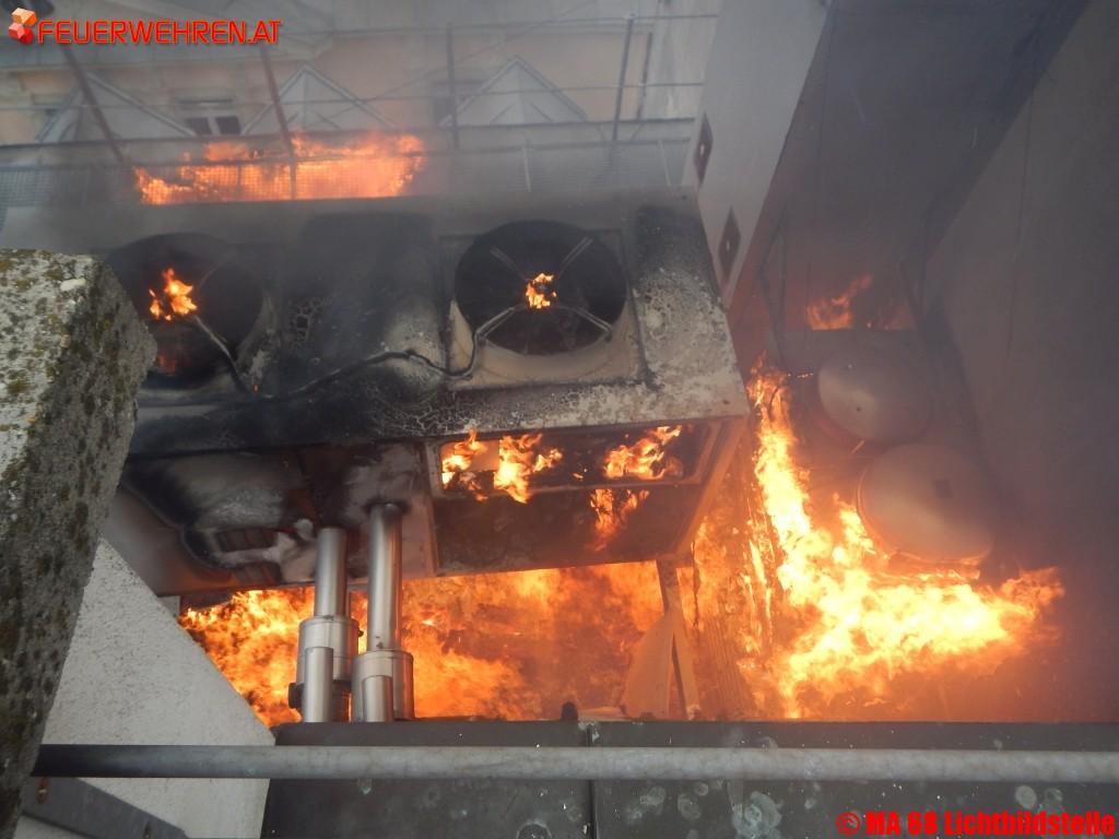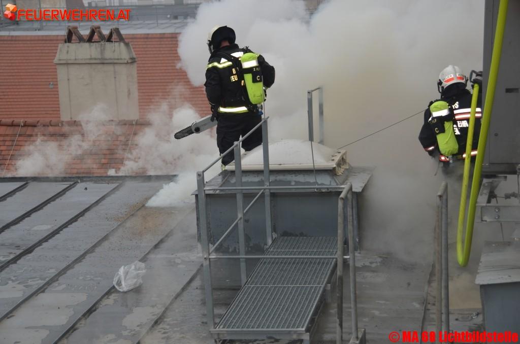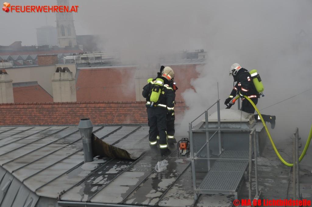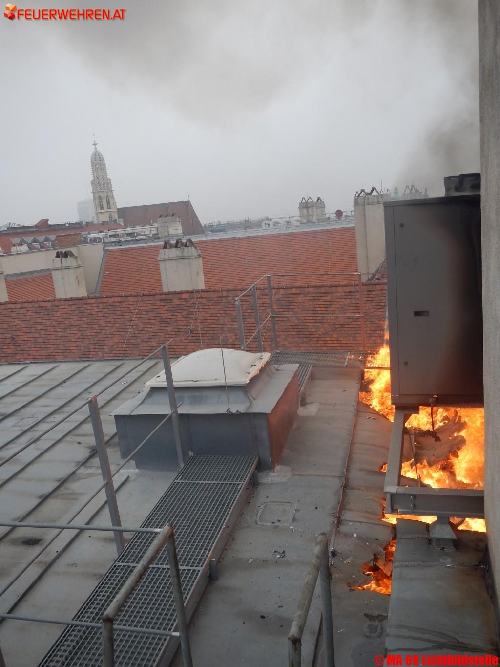 Heute am Nachmittag ist es in der Innenstadt zu einem spektakulären Dachbrand gekommen.Aus unbekannter Ursache geriet am Dach eines in Umbau befindlichen Gebäudes eine Lüftungsanlage in Vollbrand und setzte auch eine Dehnfuge des Gebäudes in Brand. Durch den raschen Einsatz der Berufsfeuerwehr Wien konnte eine Brandausbreitung auf das gesamte Dach verhindert werden. Mit mehreren Löschleitungen unter Atemschutz konnte der Brand unter Kontrolle gebracht werden. Derzeit (Stand 17:00 Uhr) sind noch umfangreiche Nachlöscharbeiten, besonders im Bereich der Gebäudedehnfuge, im Gange. Verletzt wurde niemand.