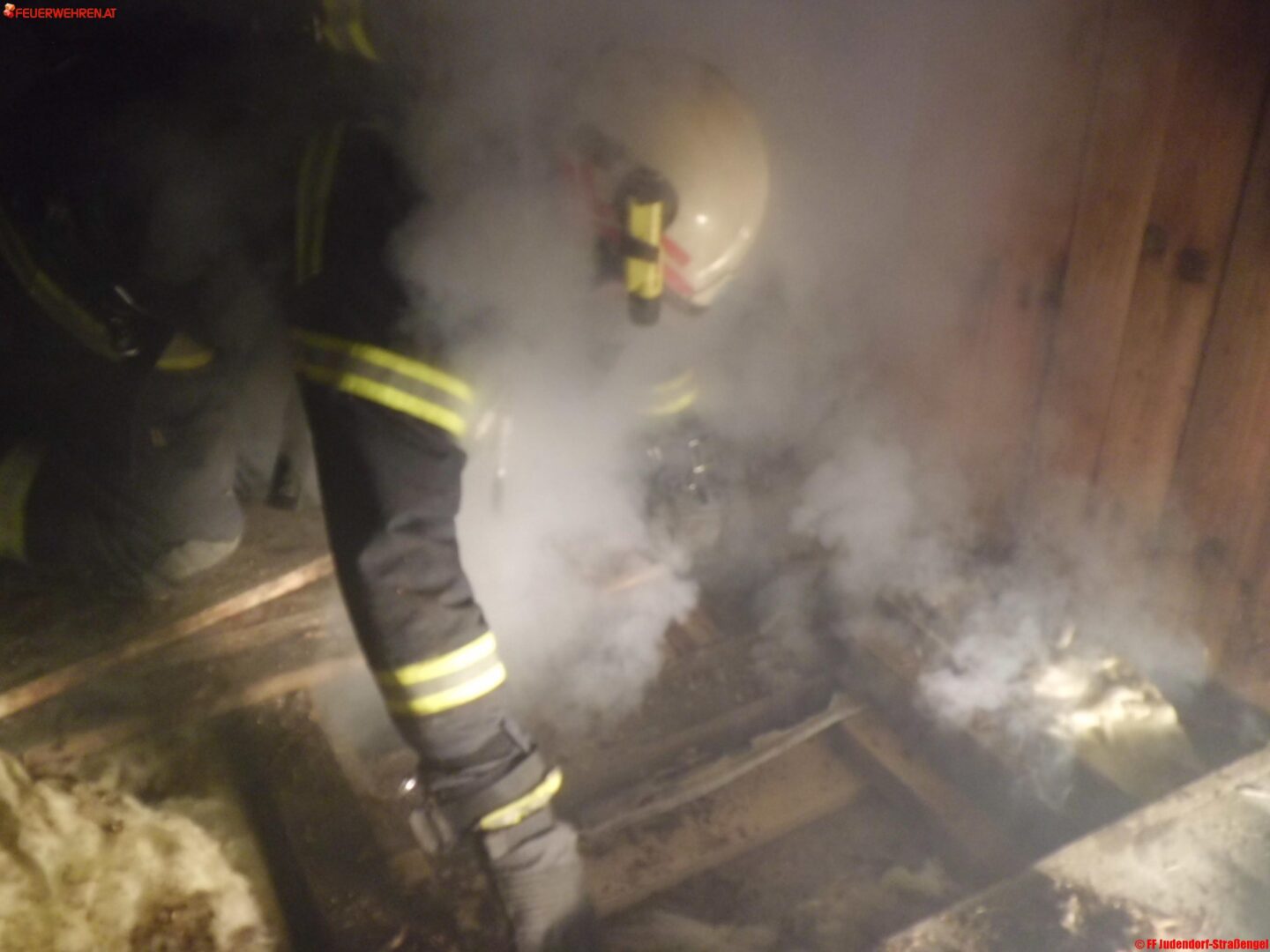 Zuerst wurde ein Atemschutztrupp zur Erkundung auf den Dachboden, von wo die Rauchentwicklung zu erkennen war, geschickt. In der Folge wurde festgestellt, dass der Brandherd im darunterliegenden Raum liegt. Hinter der Wandverkleidung konnte mit Hilfe der Wärmebildkamera eine erhöhte Wärmeentwicklung festgestellt werden. Es wurde der Entschluss gefasst, mit einem weiteren Atemschutz-Trupp und einer Motorkettensäge die Wandvertäfelung zu öffnen.