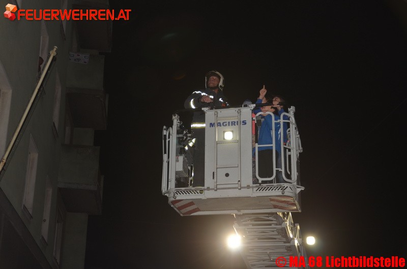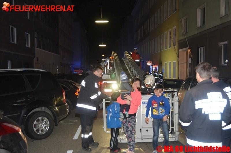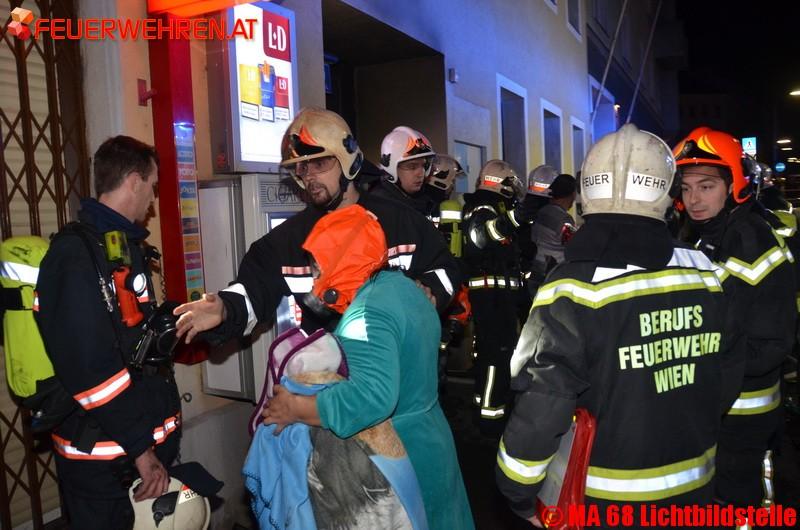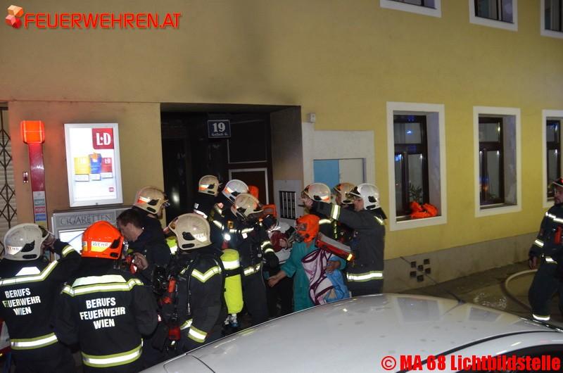 Bei Eintreffen der Feuerwehr stand die Souterrainwohnung bereits in Vollbrand, dichter Rauch drang durch ein zerbrochenes Fenster in den Innenhof und durch die Wohnungstüre ins Stiegenhaus. Dadurch war den rund 100 HausbewohnerInnen der Fluchtweg abgesperrt. Viele HausbewohnerInnen riefen von ihren Wohnungsfenstern aus um Hilfe. Sie wurden mittels zwei Drehleitern aus den straßenseitig gelegenen Wohnungen gerettet, die HausbewohnerInnen aus den hofseitigen Wohnungen wurden mittels Fluchtfiltermasken in Sicherheit gebracht.