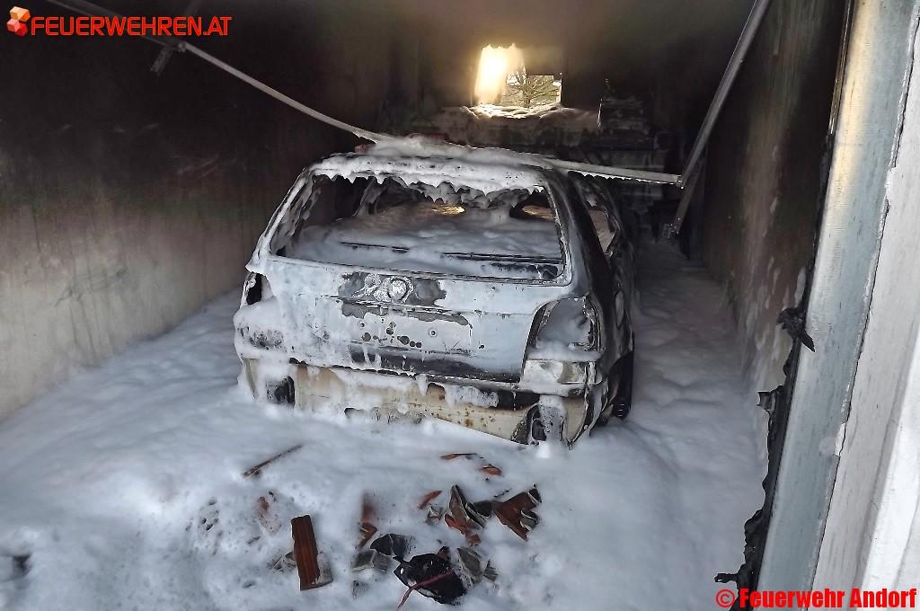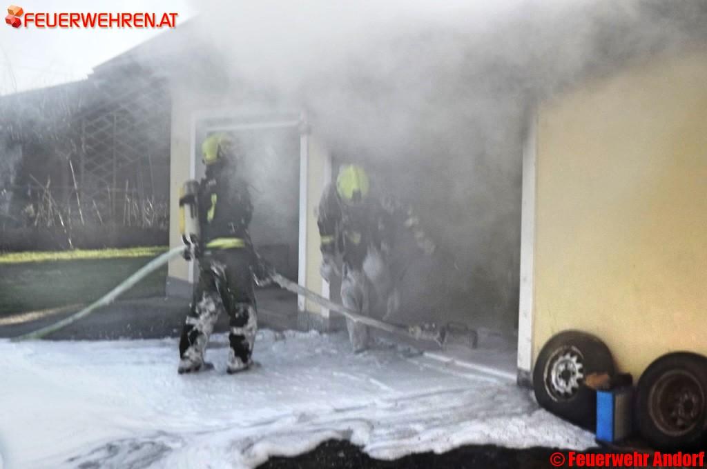 Tiefschwarze Rauchschwaden empfingen uns bei der Anfahrt zu einem Garagenbrand in der Franz-Stelzhamer-Straße inmitten von Andorf. Ein im dortigen Nebengebäude abgestelltes Kraftfahrzeug hatte aus bislang unbekannter Ursache Feuer gefangen.