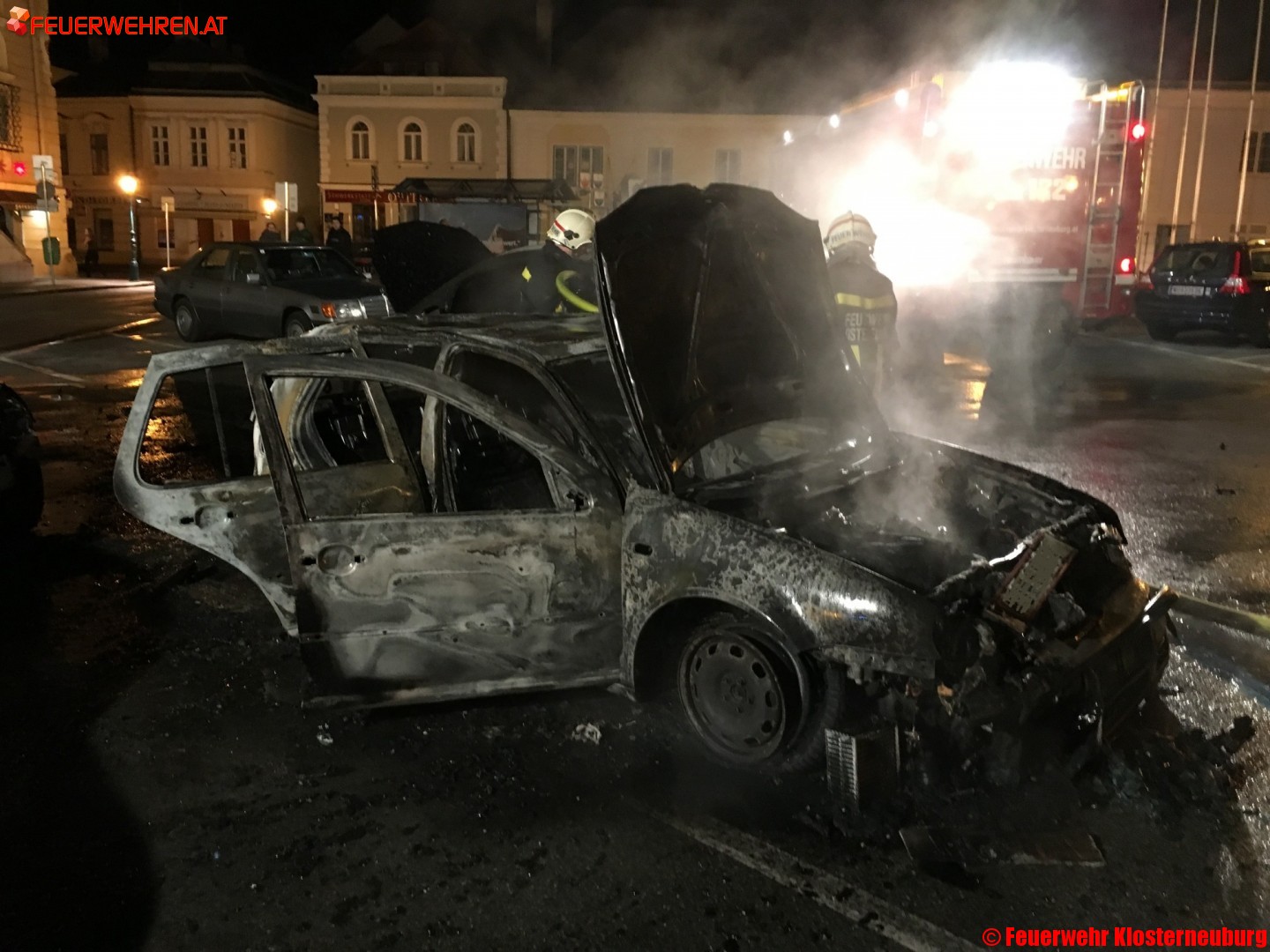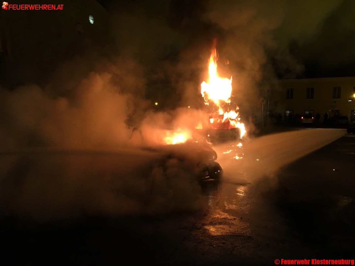 Um 03:02 Uhr wurden beide Züge der Feuerwehr Klosterneuburg zu einem Fahrzeugbrand auf den Rathausplatz alarmiert. Schon bei der Ausrückemeldung wurden die Einsatzkräfte darüber informiert, dass bereits mehrere Fahrzeuge in Brand geraten sind.